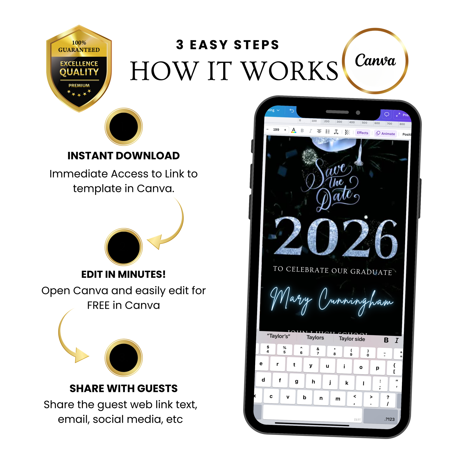 Mit dieser Videoeinladung zur Abschlussfeier 2026 erzielen Sie sofortige Wirkung. Online bearbeiten, exportieren und innerhalb weniger Minuten versenden – eine moderne, für mobile Geräte optimierte Einladung, die auf jedem Bildschirm fantastisch aussieht.