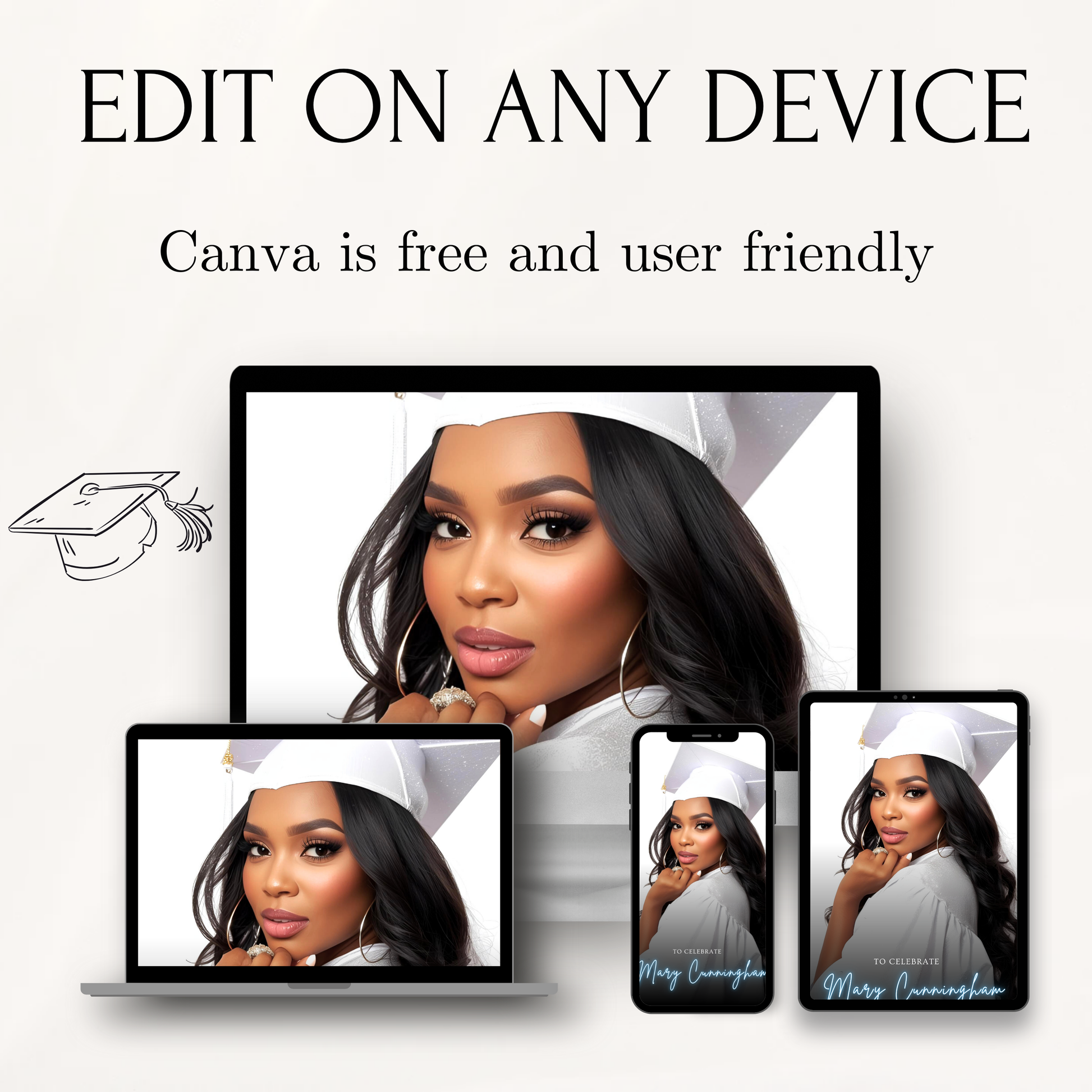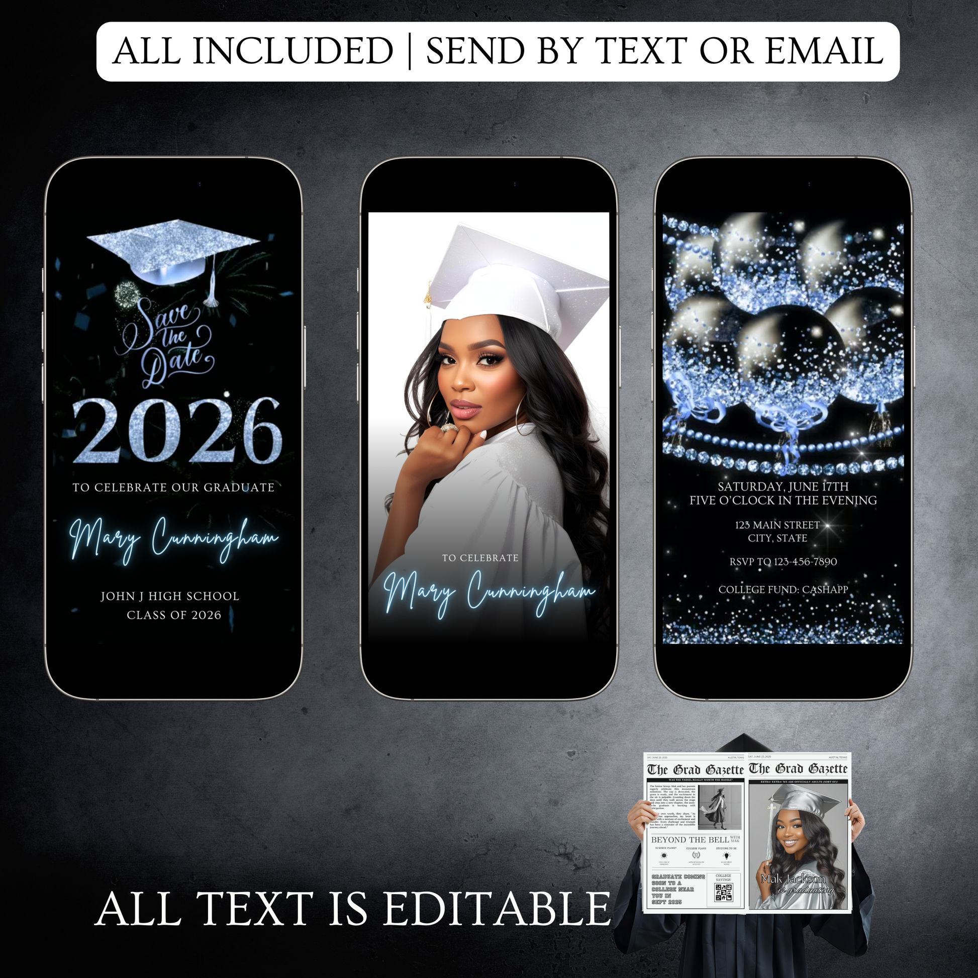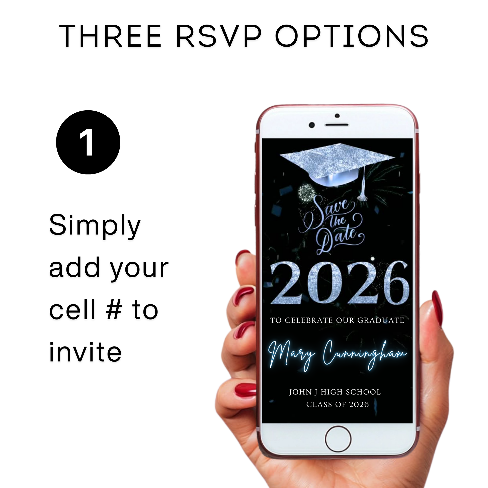 Videoeinladung zur Abschlussfeier 2026 | Digitale blaue Einladung zur Antwort (RSVP) | Bearbeitbare Online-RSVP-Vorlage (Canva)