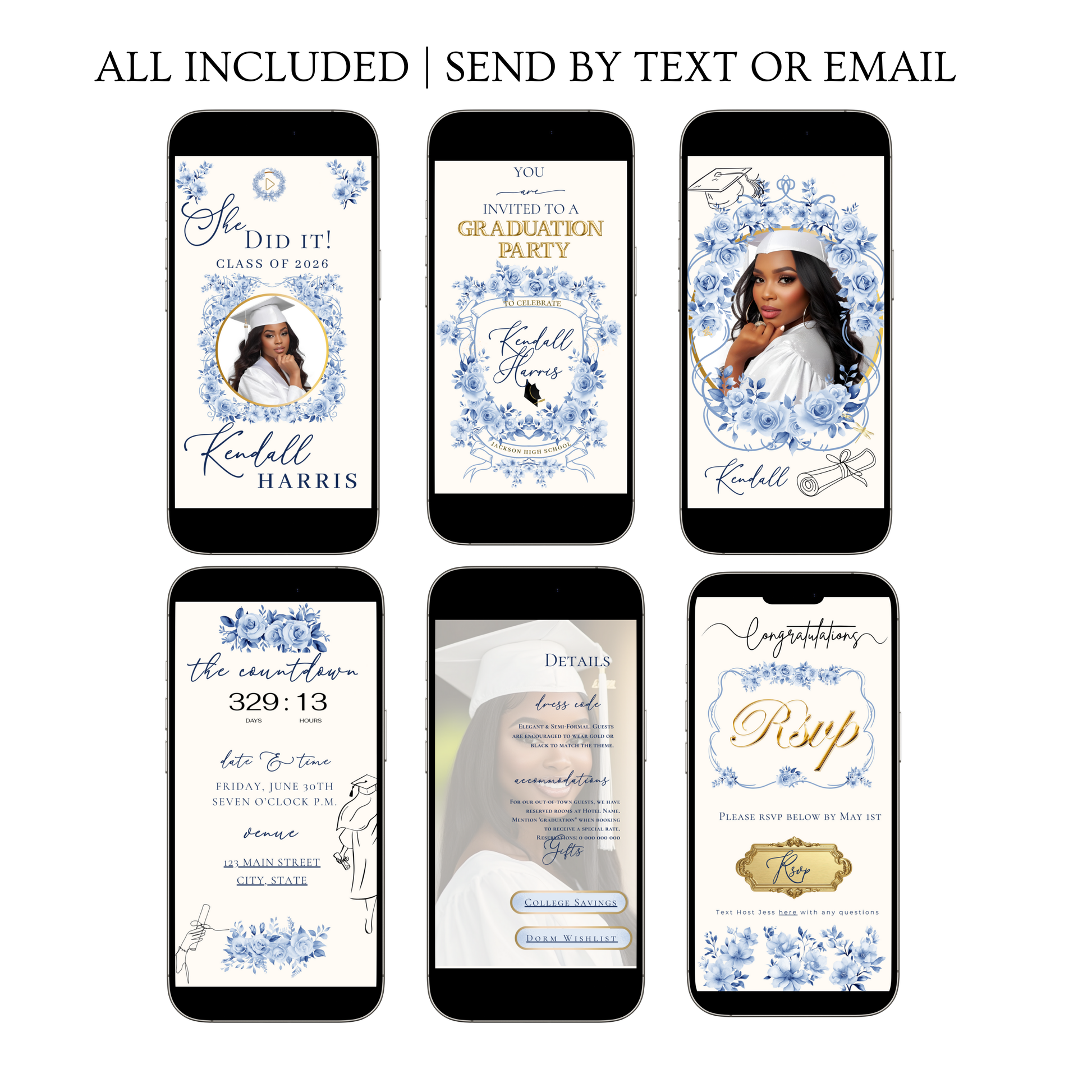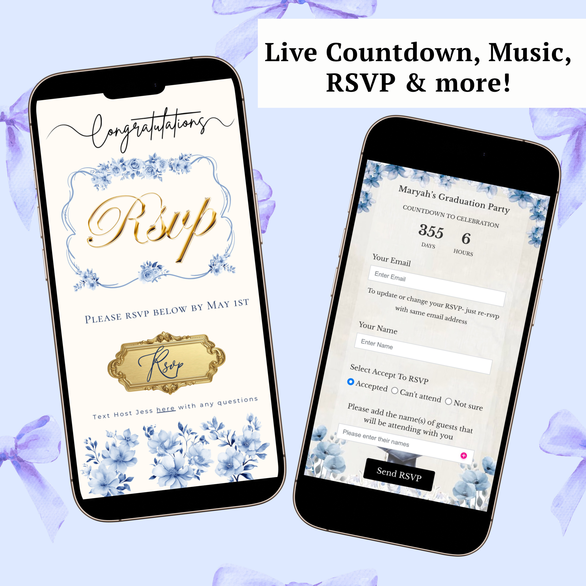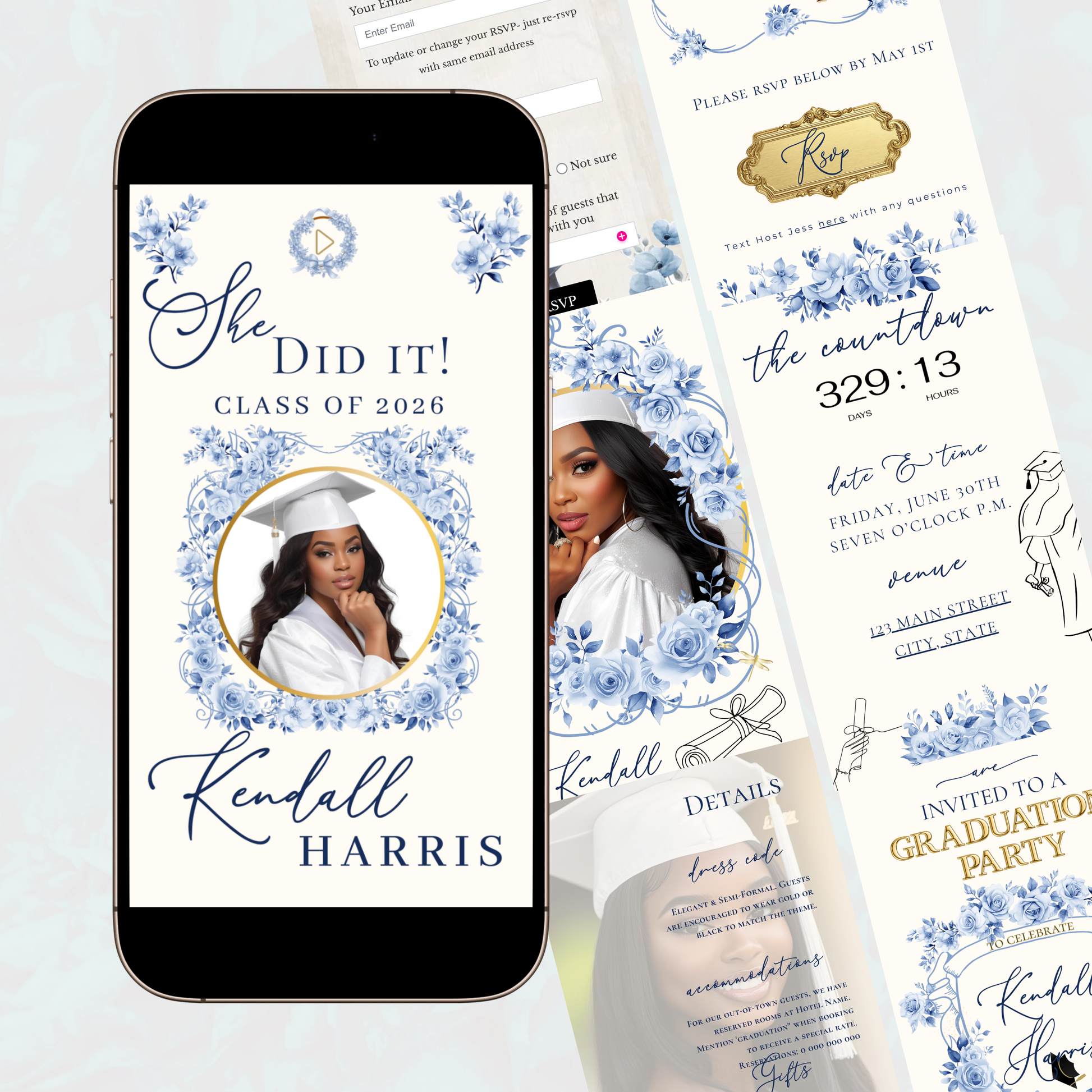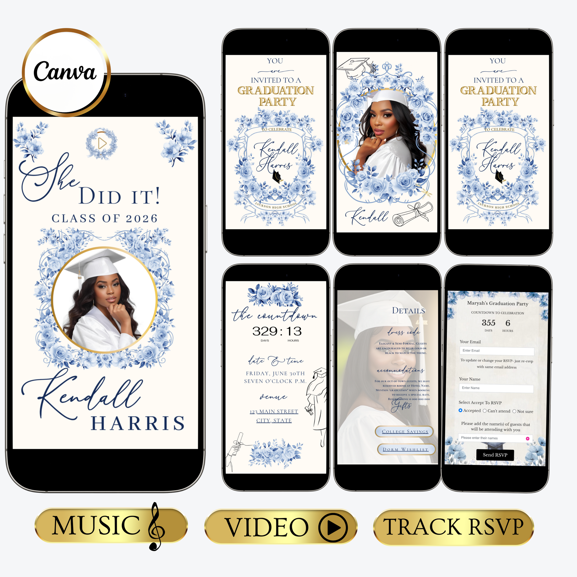 Einladung zur Abschlussfeier 2026 | Canva-Vorlage für Antwortmöglichkeit mit Musik | Blaues Blumenmuster für sie