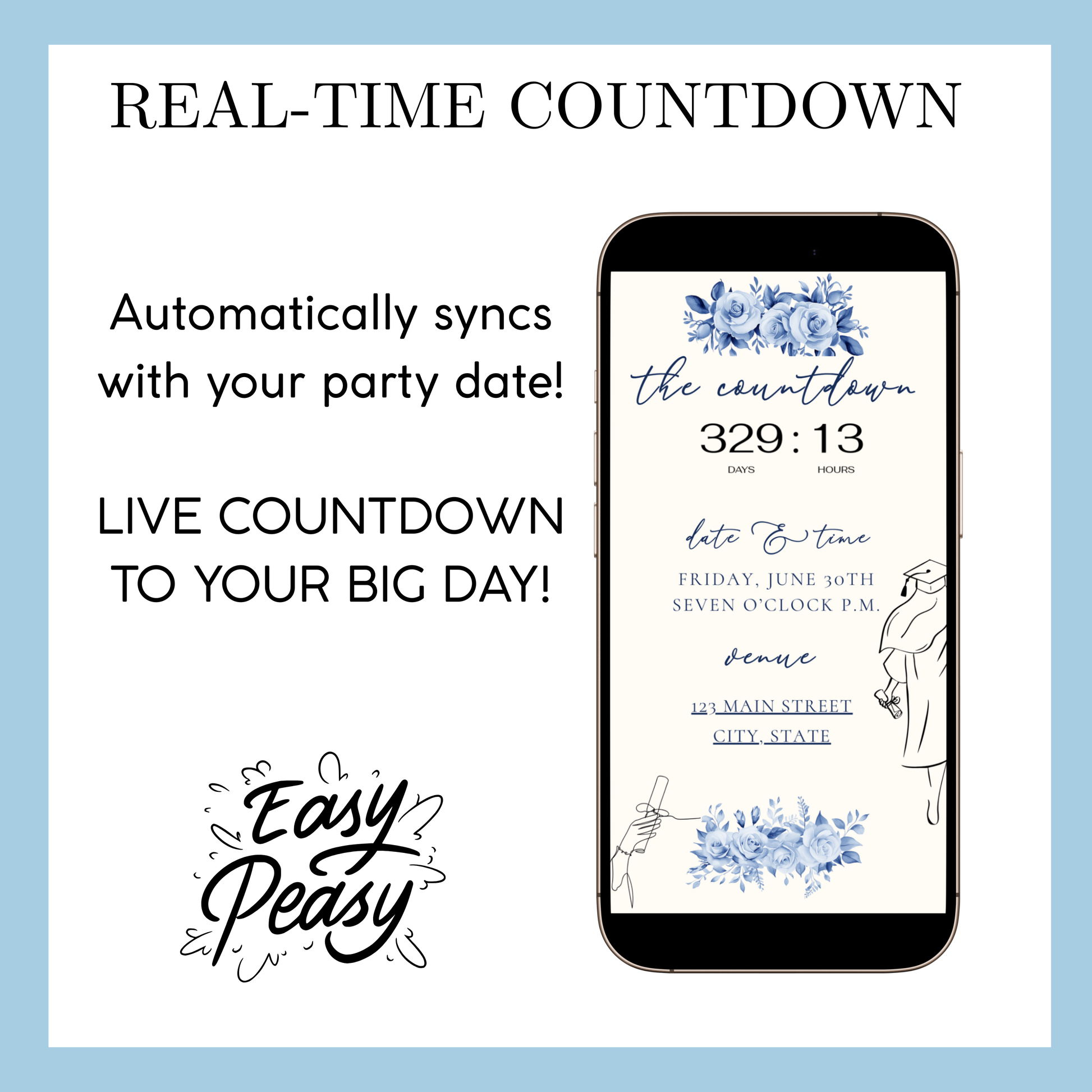 Feiern Sie Ihren Absolventen stilvoll mit dieser eleganten animierten Videoeinladung und RSVP-Website für den Abschlussjahrgang 2026! Ihre Gäste können die Videoeinladung abspielen, Details zur Veranstaltung einsehen, den Countdown verfolgen und direkt auf der Seite zu- oder absagen. Die Einladung besticht durch ein florales Design und eine Absolventenmütze. Diese animierte Website-Einladung ist perfekt für Schul- oder Hochschulabschlussfeiern und beeindruckt durch ihr ansprechendes Design, das sich zudem kinderleicht personalisieren lässt.