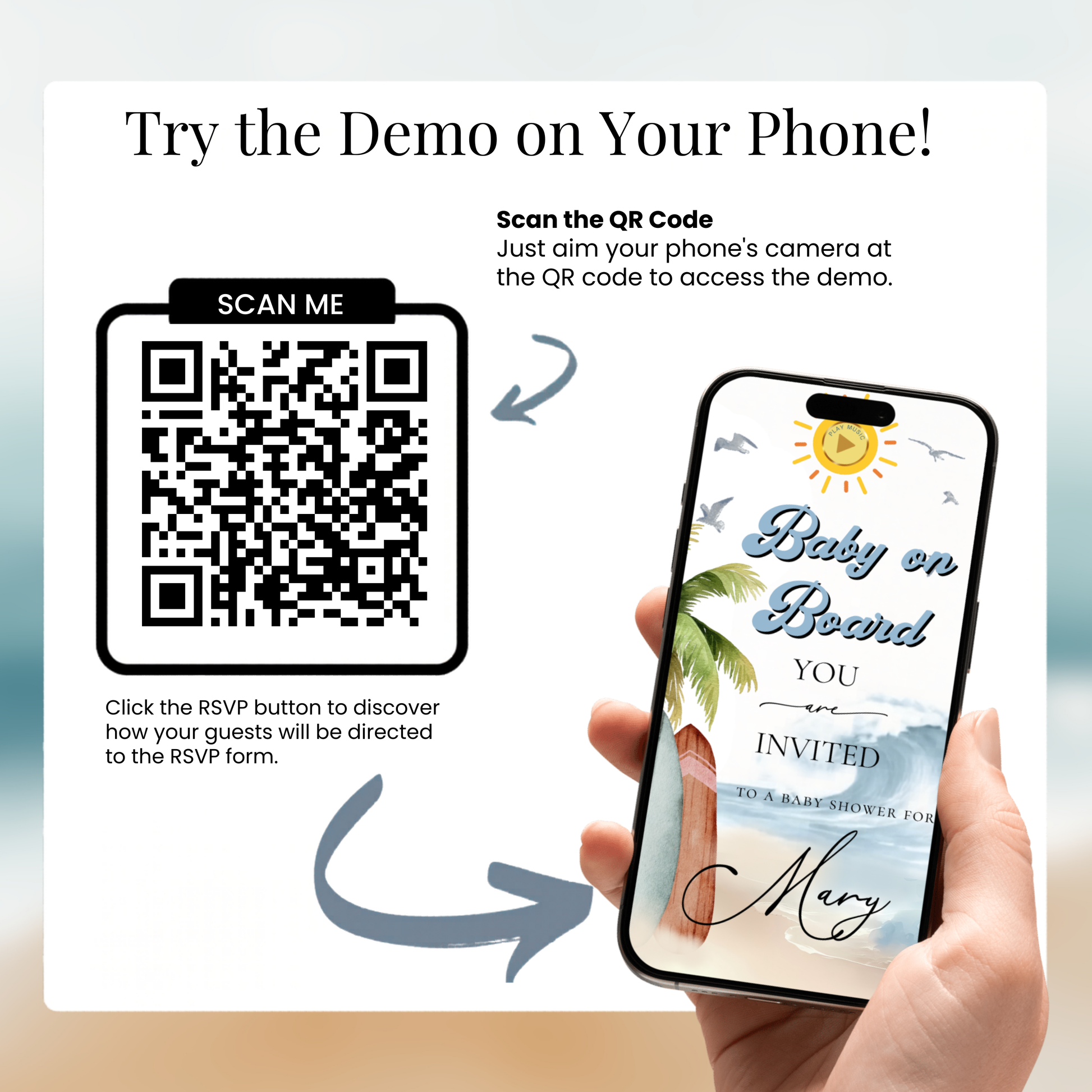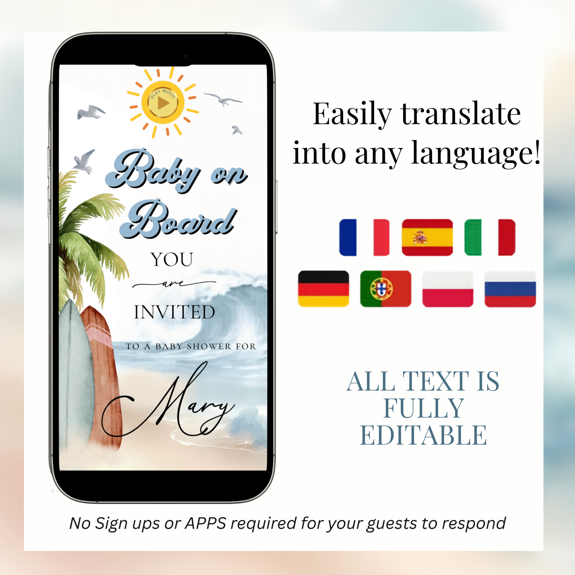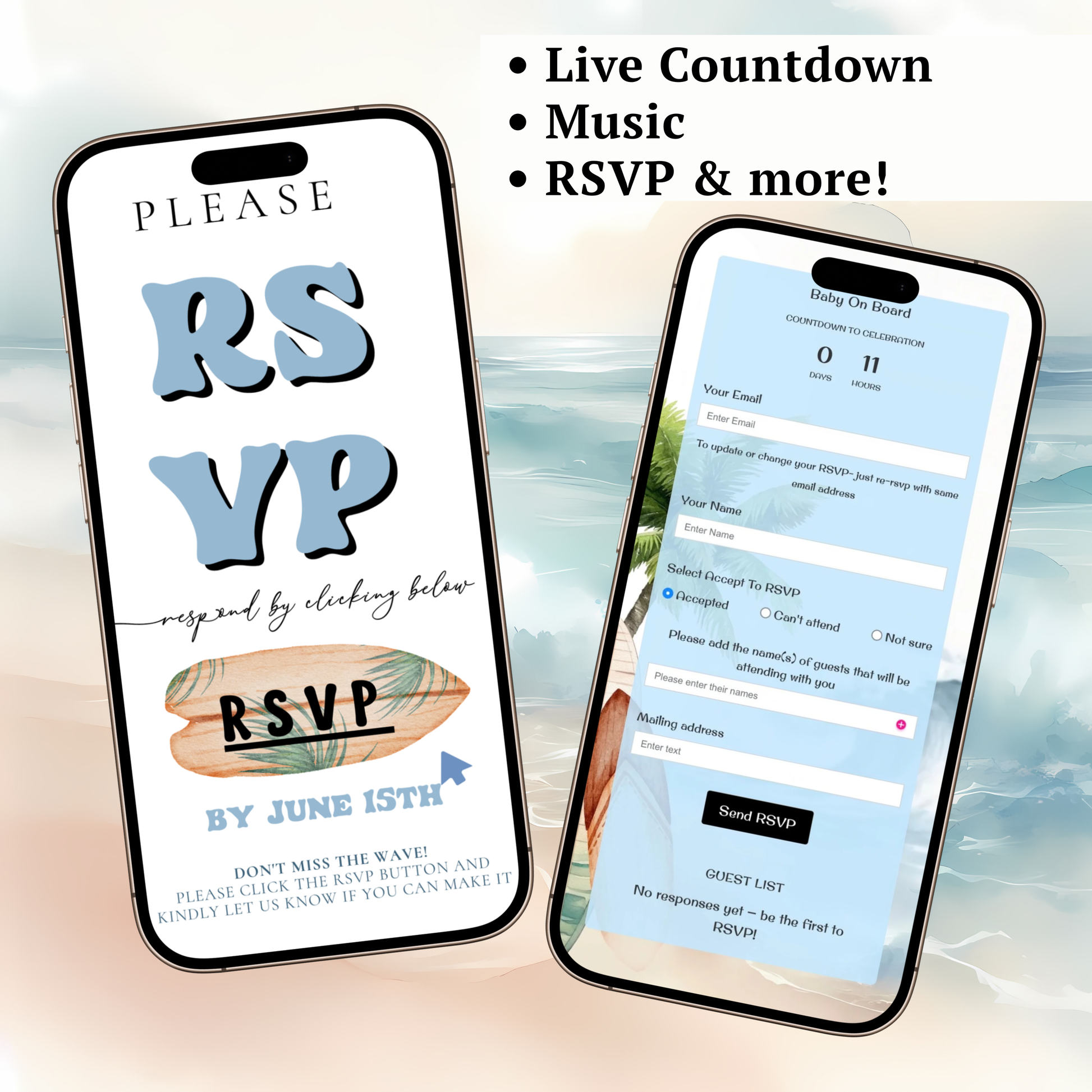 Surf’s up! Celebrate your baby in style with this beach themed Baby on Board animated website invitation Guests can tap to play your video invite, explore event details, view the countdown, and RSVP directly from the page. Featuring a surging, beach vibes and waves. This animated boh baby shower website invite is perfect for baby showers or 1st birthdays and is designed to impress while being incredibly easy to customize.