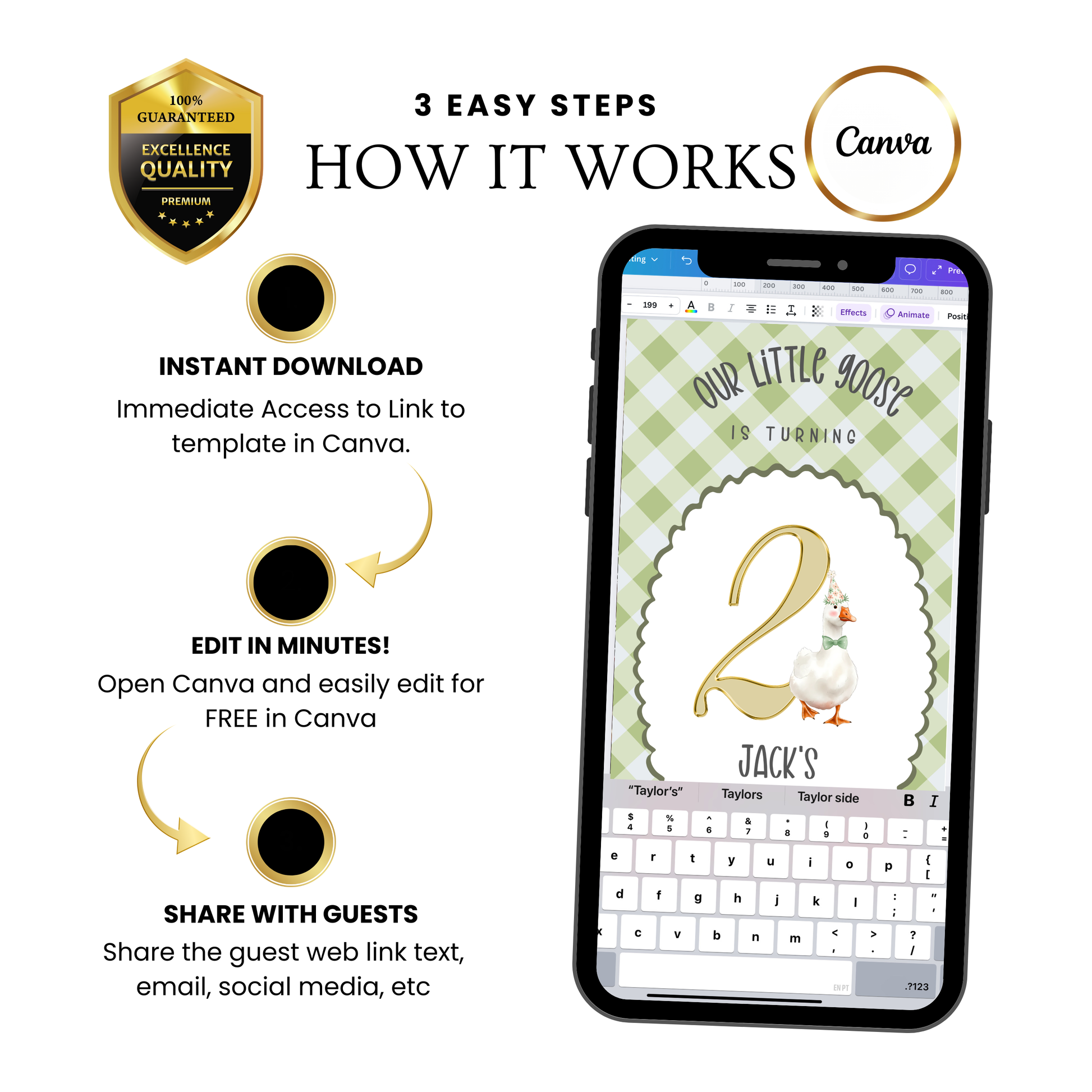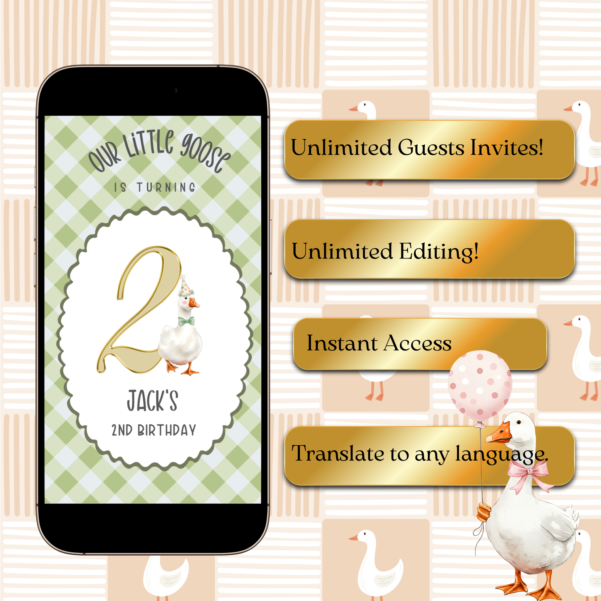 - Vollständig editierbar – Namen, Datum, Uhrzeit, Veranstaltungsort und RSVP-Details personalisieren