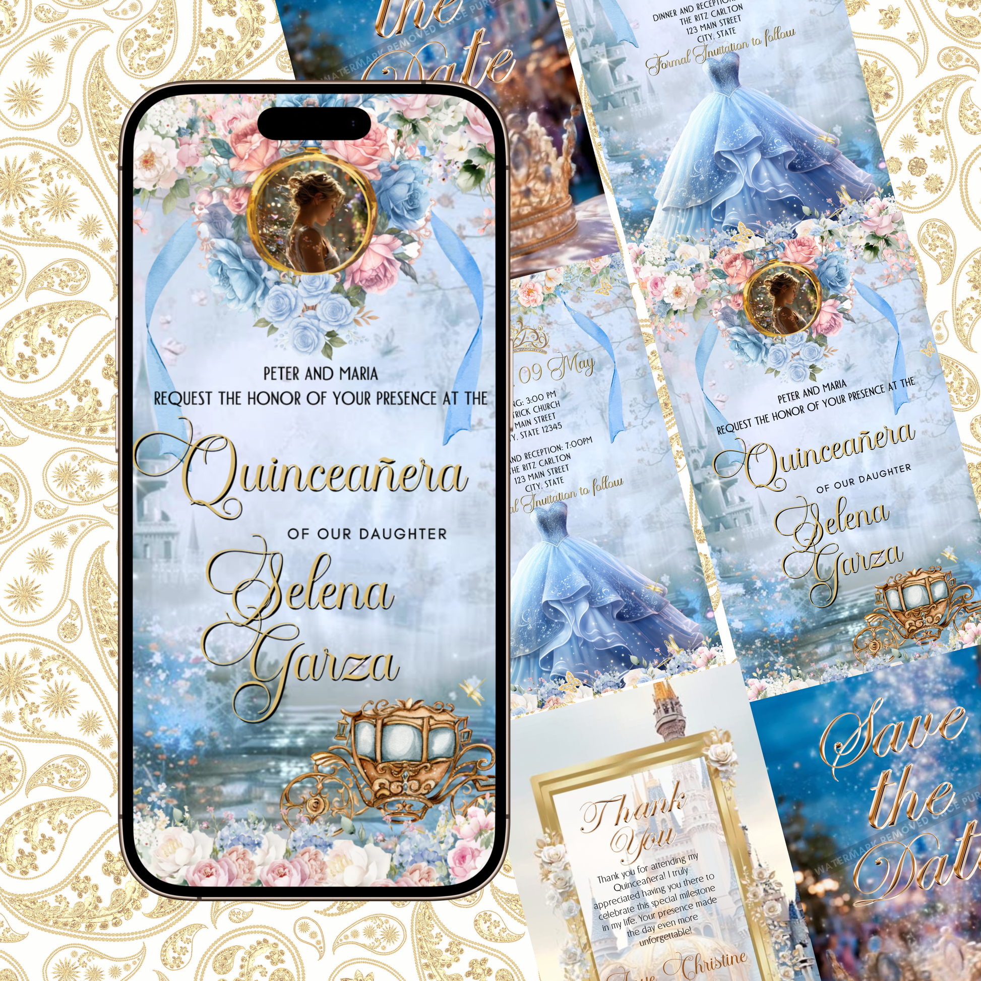 Celebrate her magical night with this Editable Cinderalla Quinceañera Video Invitation Canva Template! Designed in a stunning Cinderella-inspired blue gown theme with gold accents, floral details, and a royal carriage, this animated vertical video invite is perfect for Quinceañeras, Sweet 16 parties, and princess-themed celebrations.
