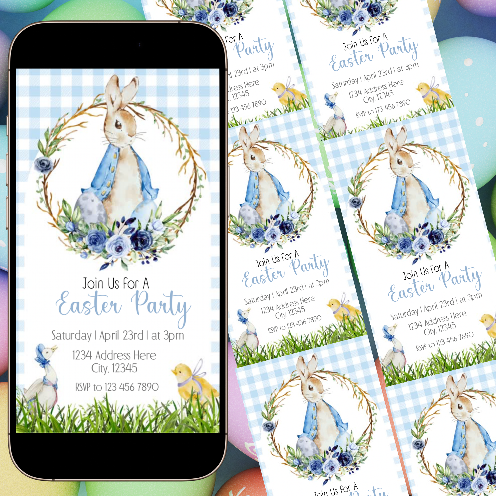Bearbeitbare Vintage-Einladung mit Hasenmotiv, Märchenbuch-Hasenparty-Einladung, blau-weiß kariert, digital, Ostern, Geburtstag, Babyparty, Teeparty, bearbeitbare E-Einladung