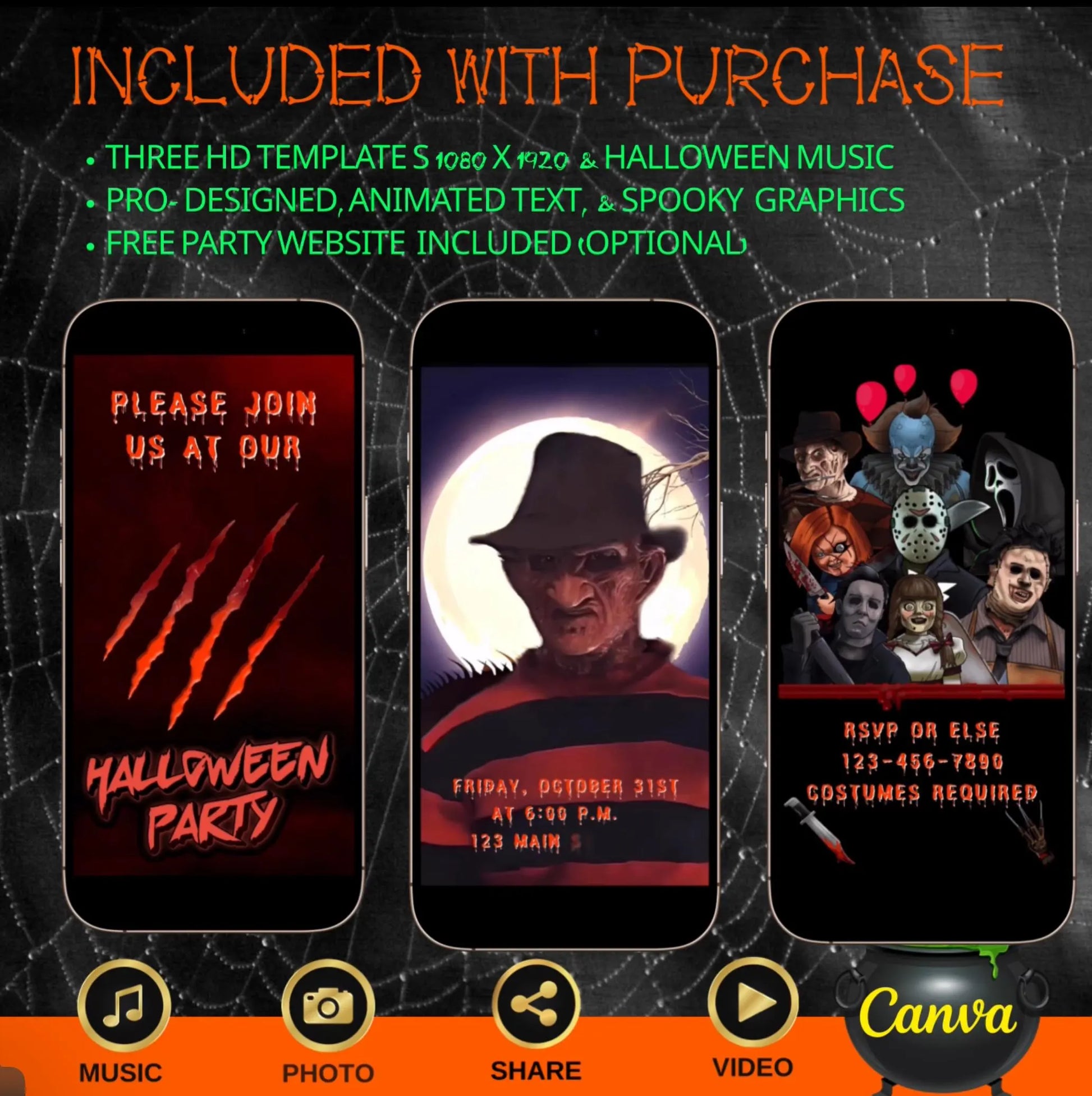 🕸 Halloween-Magie – Halloween-Videohintergrund, gruselige Schriftart, animierte Elemente und unheimliche Musik für eine lustige Halloween-Einladung, die Ihre Gäste lieben werden .