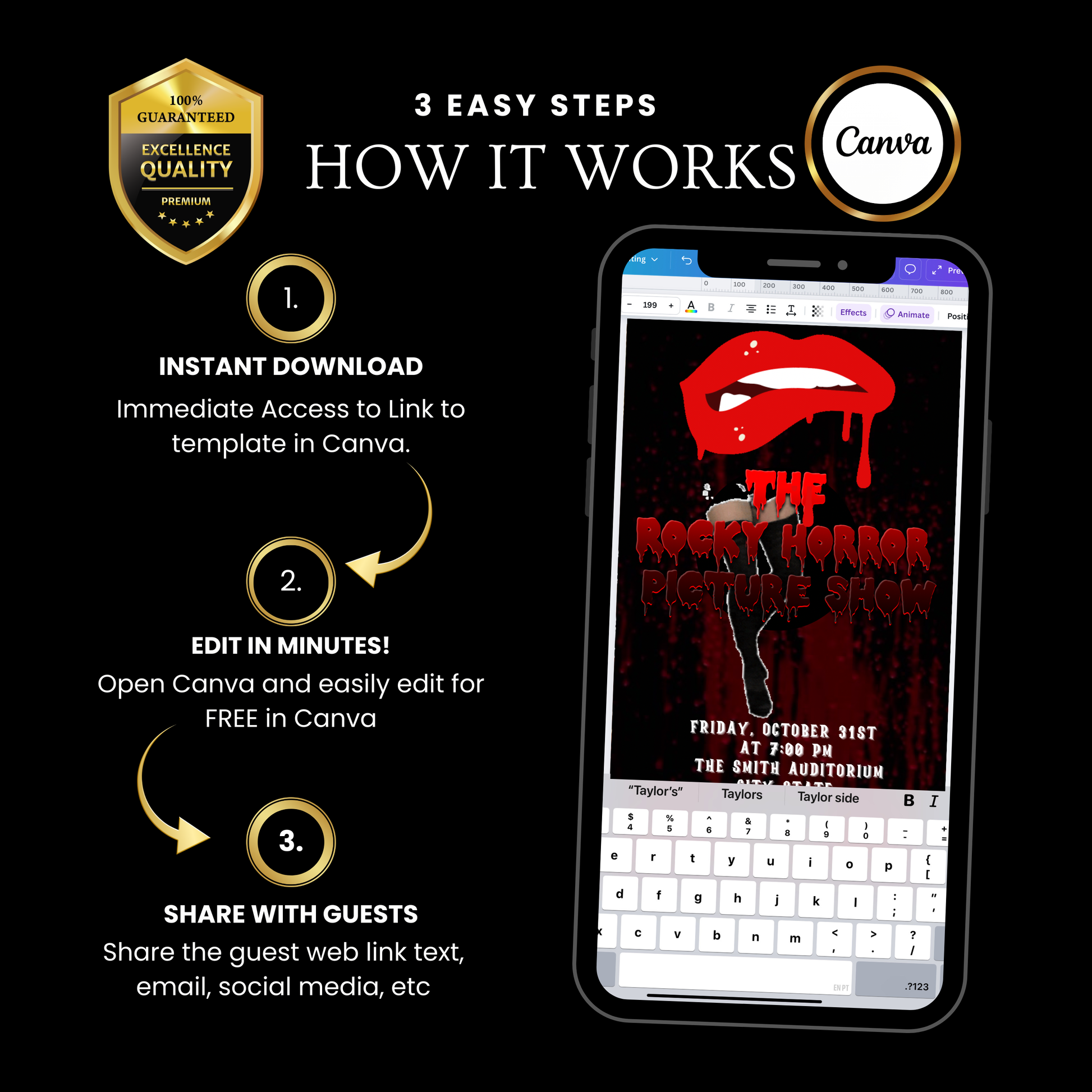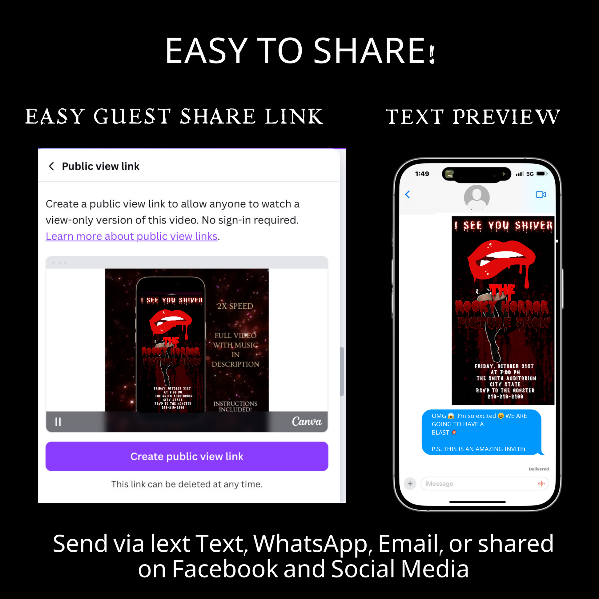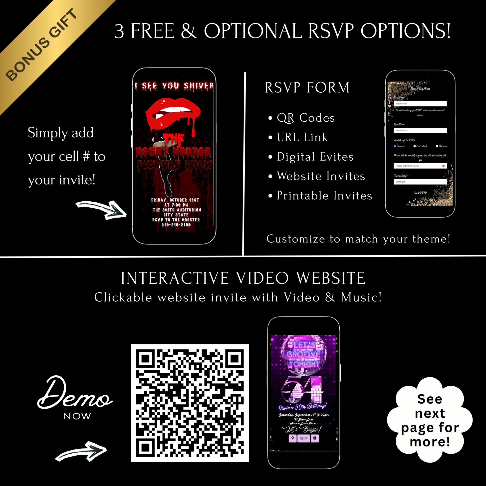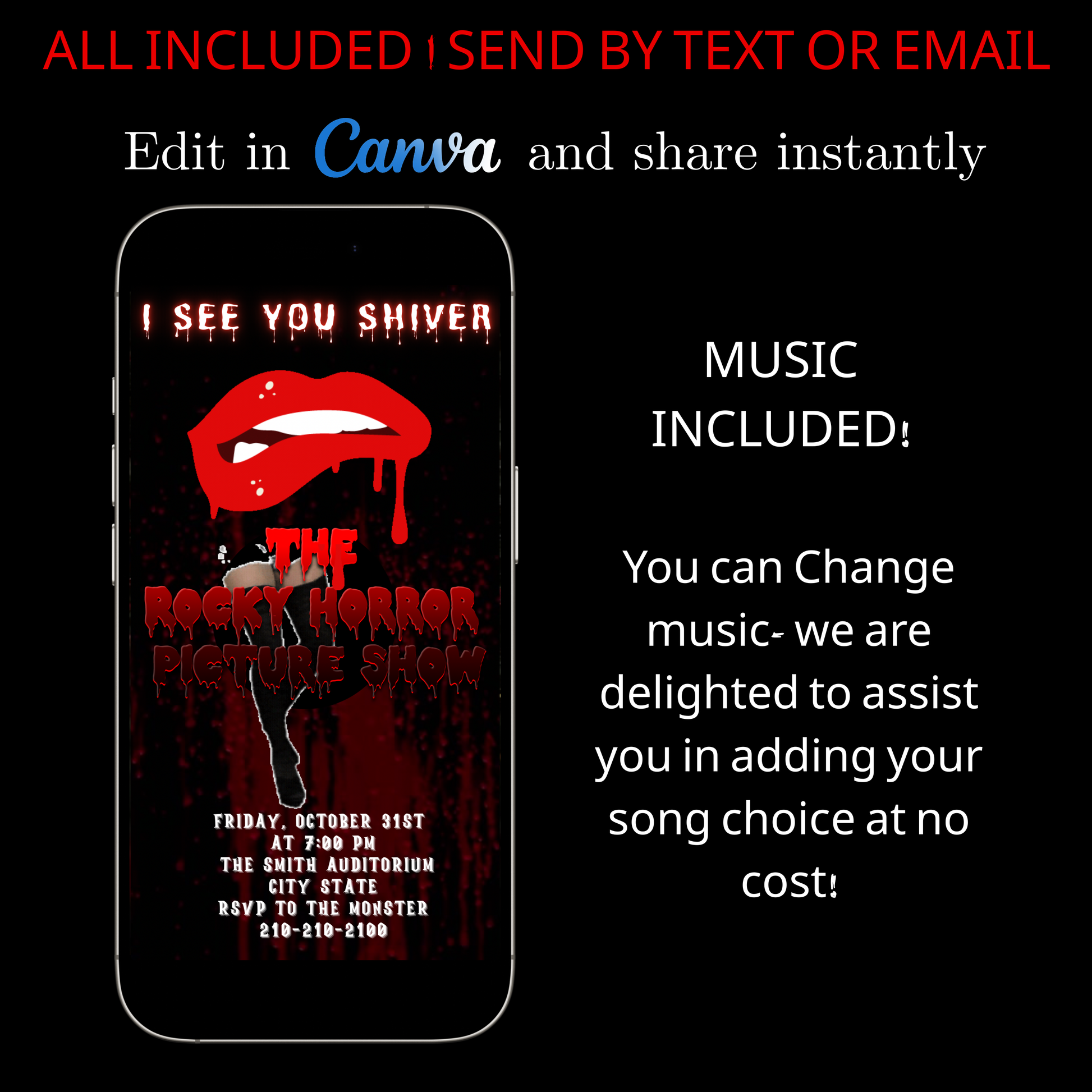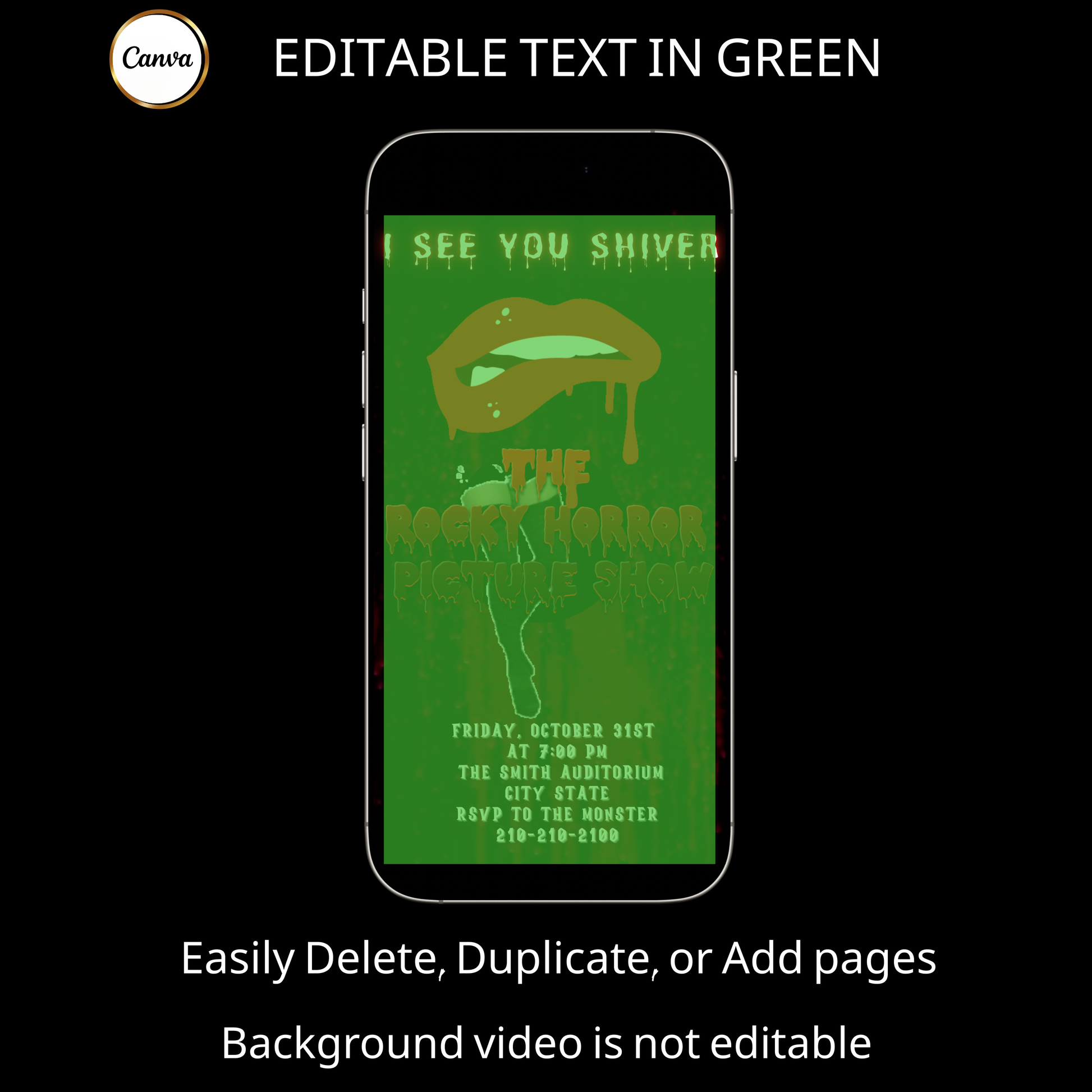 Halloween-Videoeinladung, animierte Einladung zur Rocky Horror Picture Show, bearbeitbare mobile Halloween-Party-Einladung