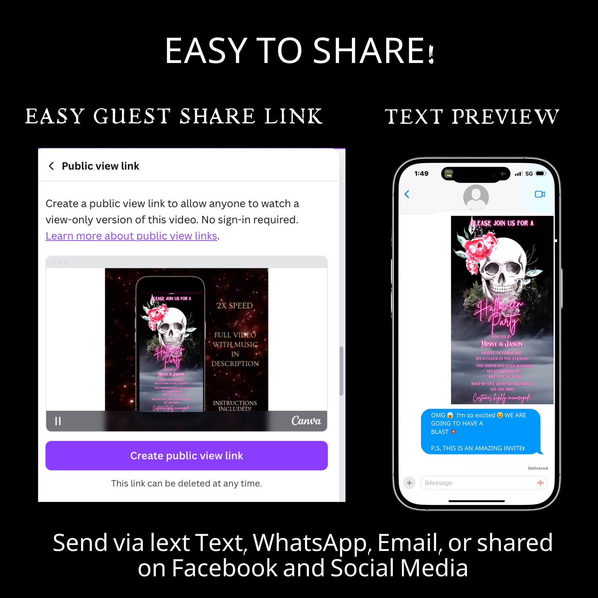 🎬 Mobile-freundliche Videoeinladung – Sofort per SMS, E-Mail, WhatsApp oder über soziale Medien versenden.