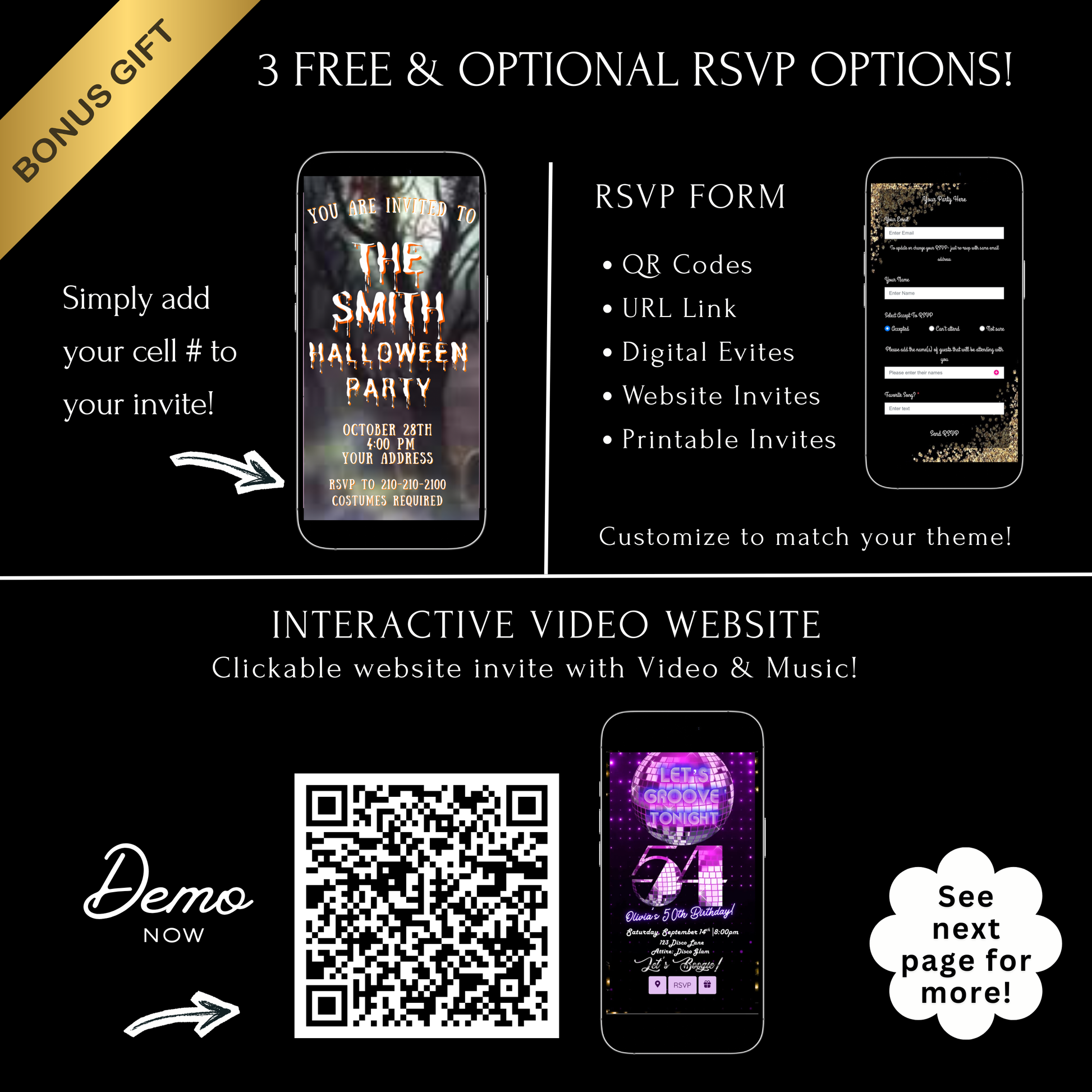 Sorgen Sie mit unserer editierbaren Halloween-Party-Videoeinladung für die richtige Stimmung für eine schaurig-schöne Nacht. Dieses aufregende Halloween-Design ist perfekt für Kostümpartys, Treffen in Spukhäusern oder jede andere Feier am 31. Oktober. Mit leuchtenden Halloween-Farben, gruseligen Animationen und passender Gruselmusik werden Ihre Gäste die Tage bis zum großen Abend zählen.