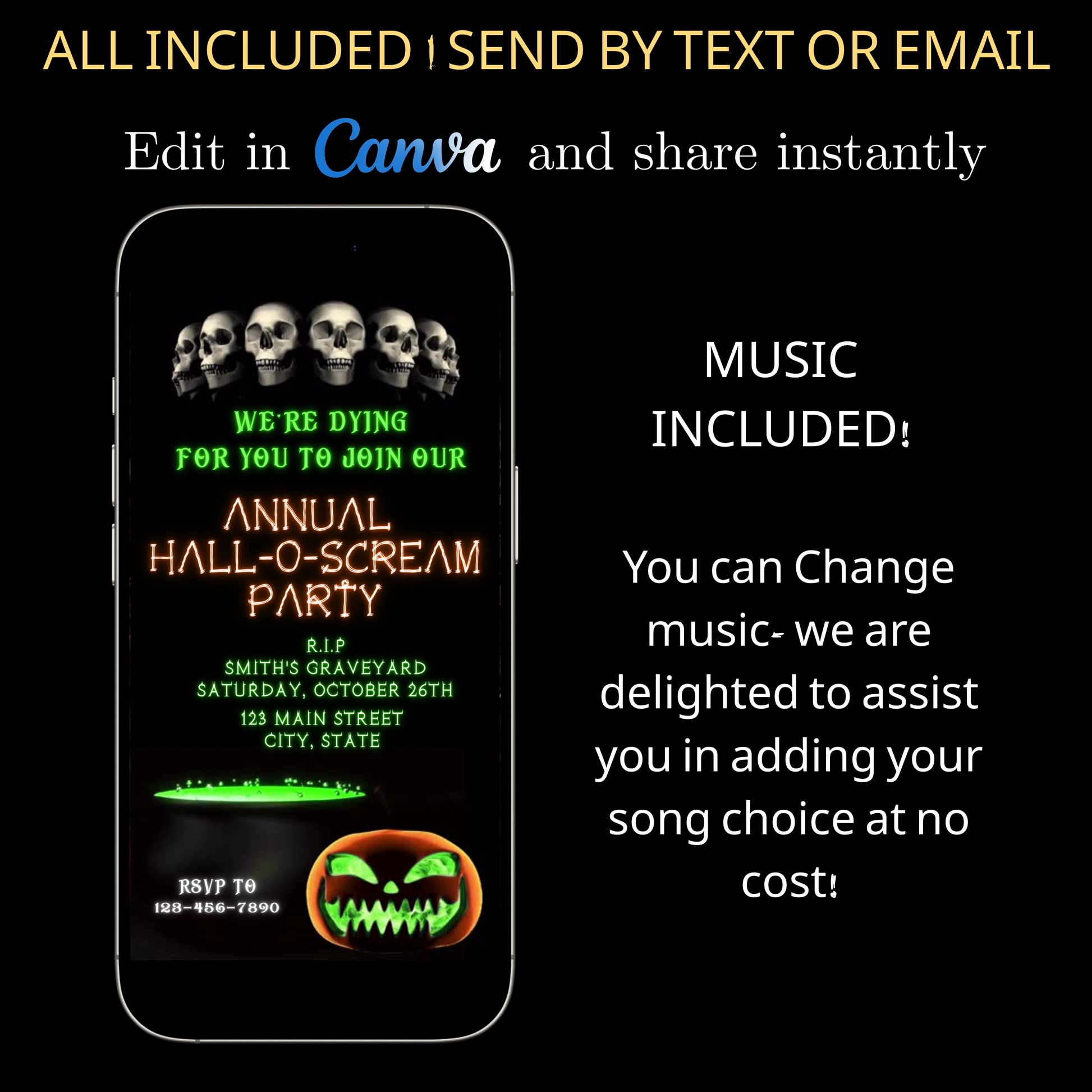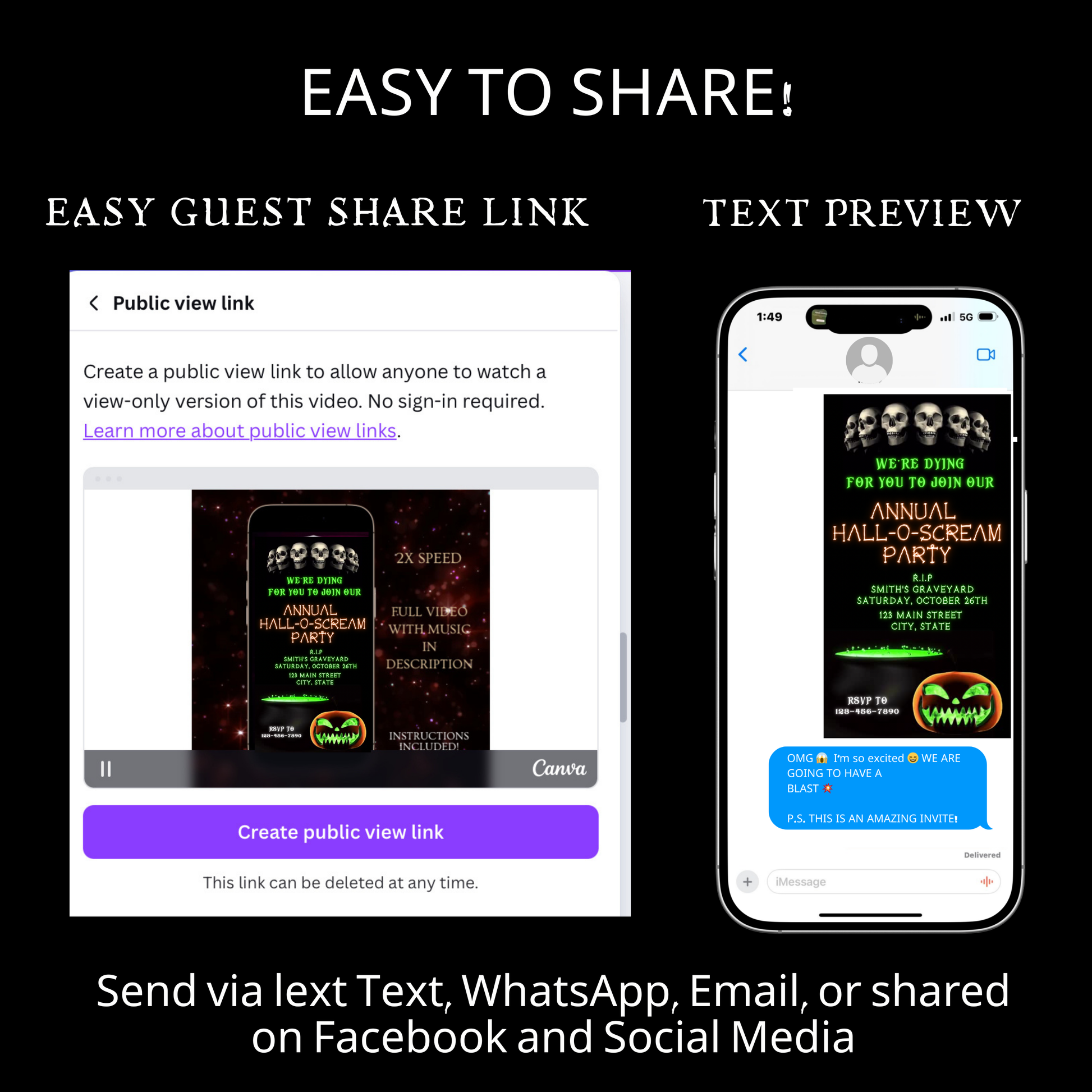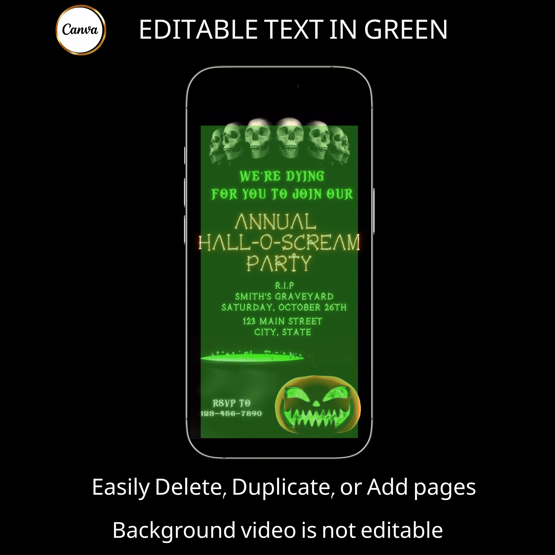 Halloween-Videoeinladung, animierte Einladung mit Totenköpfen und Skeletten, bearbeitbare mobile Einladung zur Halloween-Party