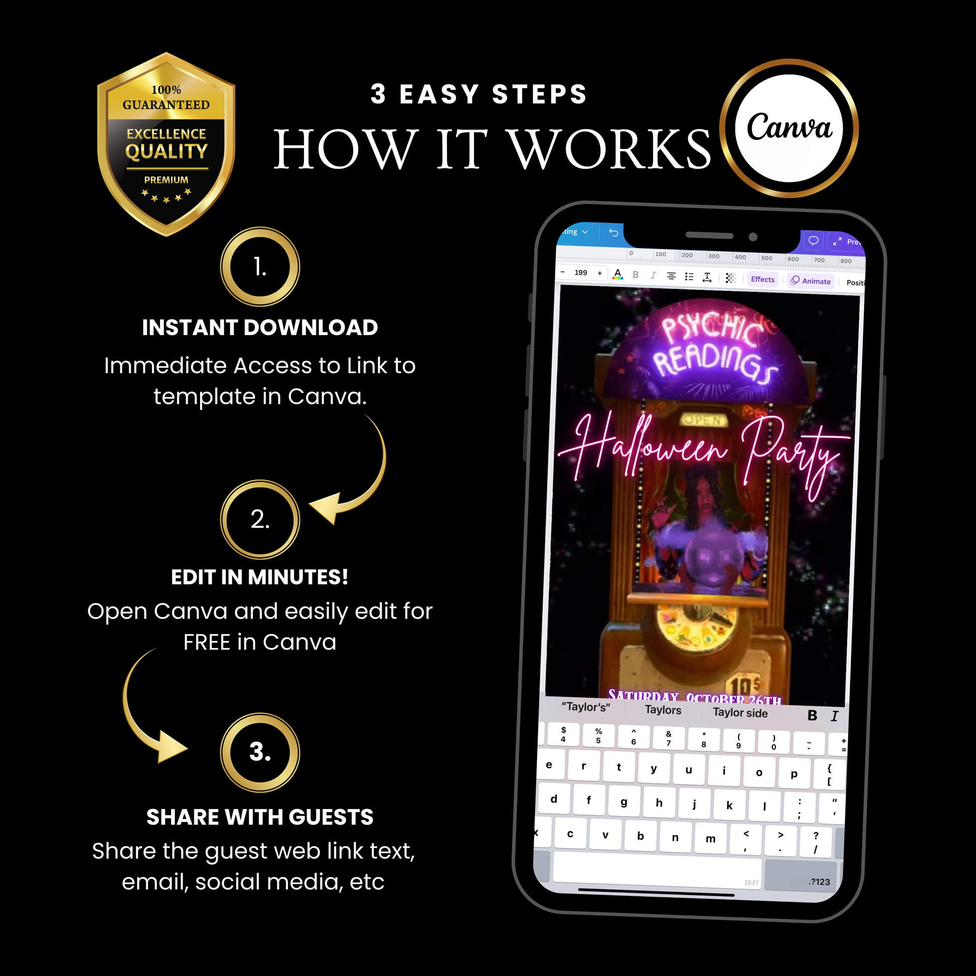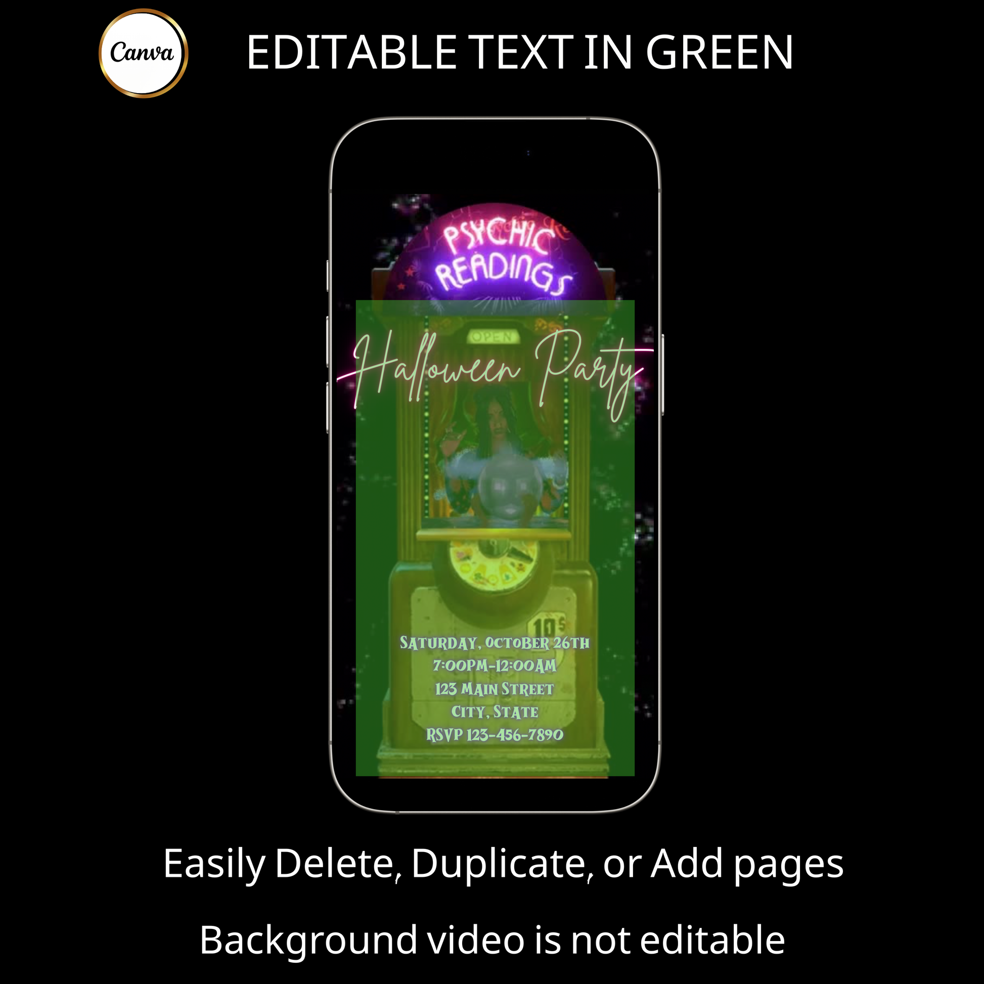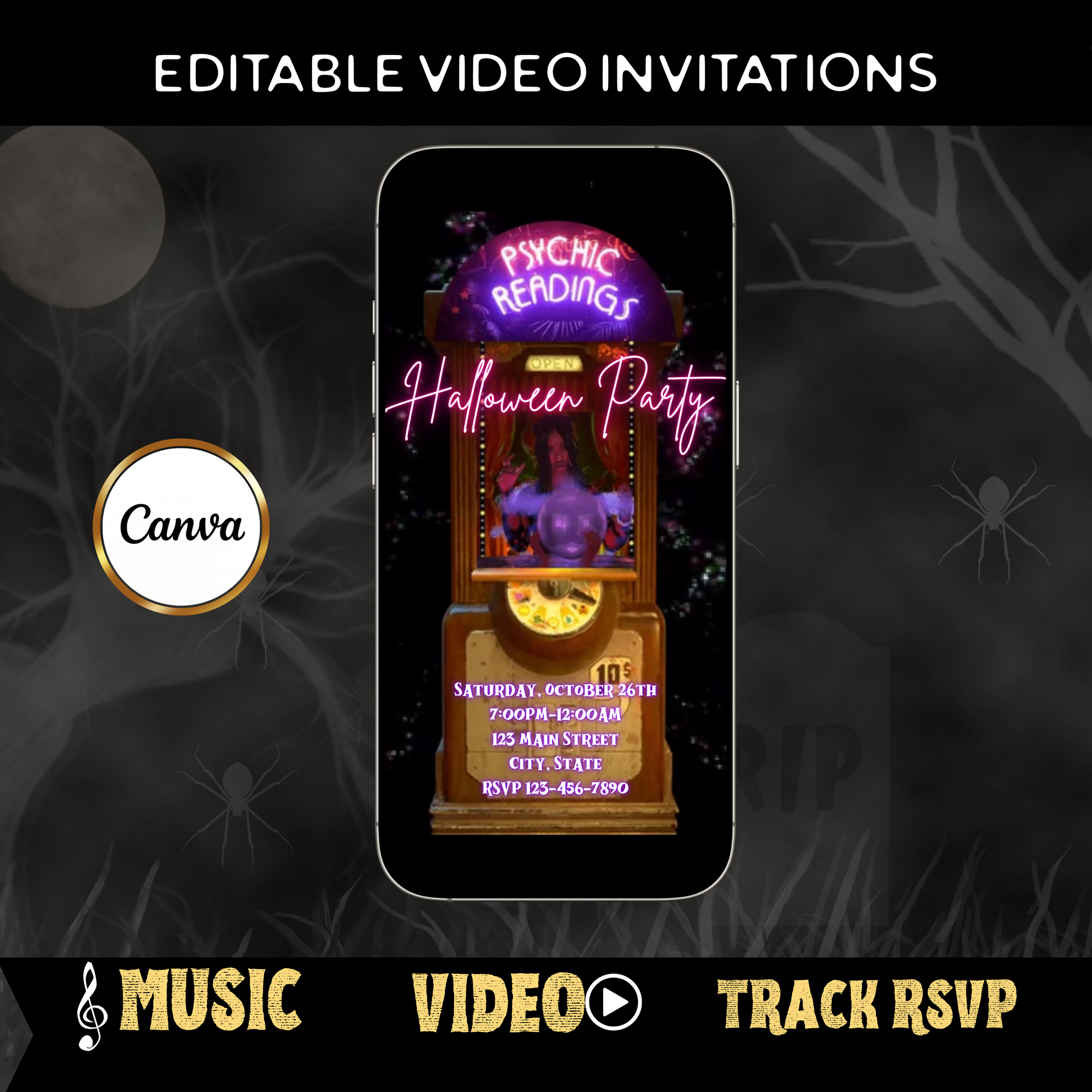 Halloween-Videoeinladung, animierte Einladung mit Wahrsager-Motiv, bearbeitbare mobile Einladung zur Halloween-Party