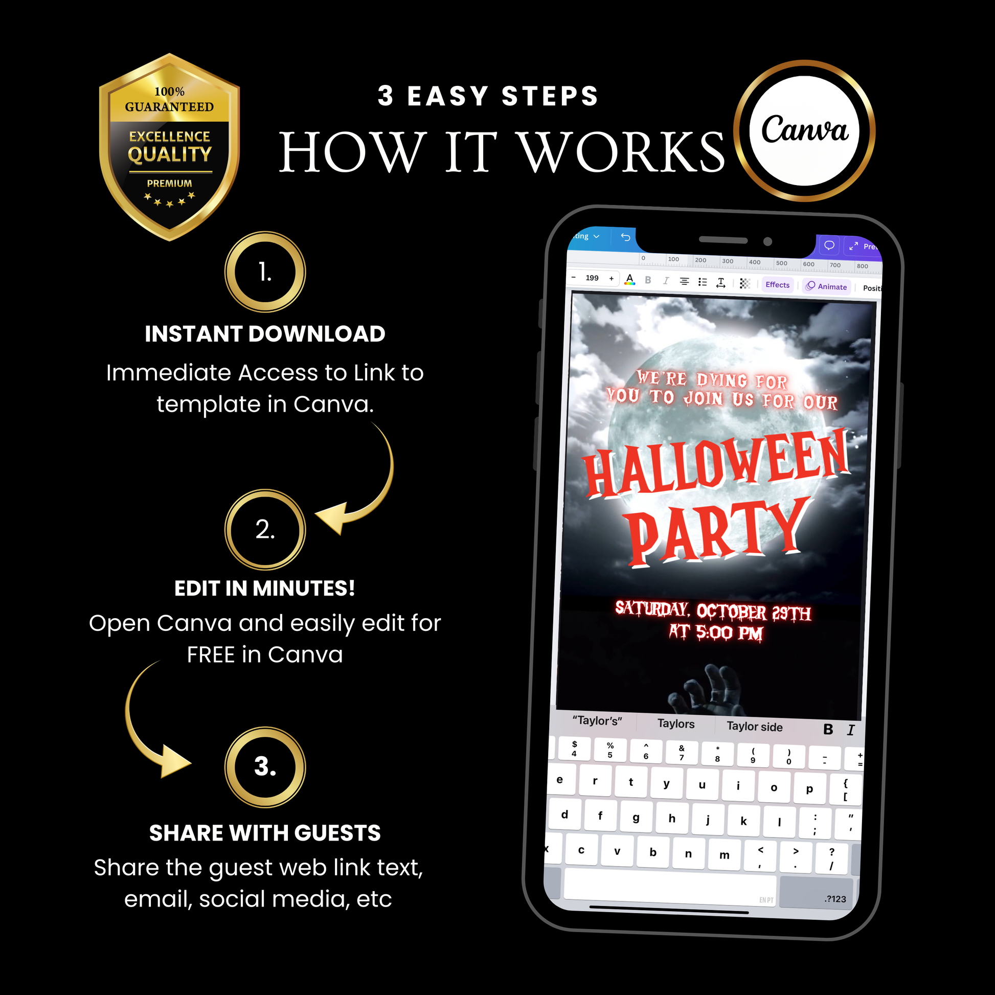 Halloween-Videoeinladung, animierte Einladung mit der Hand aus dem Grab, bearbeitbare mobile Einladung zur Halloween-Party