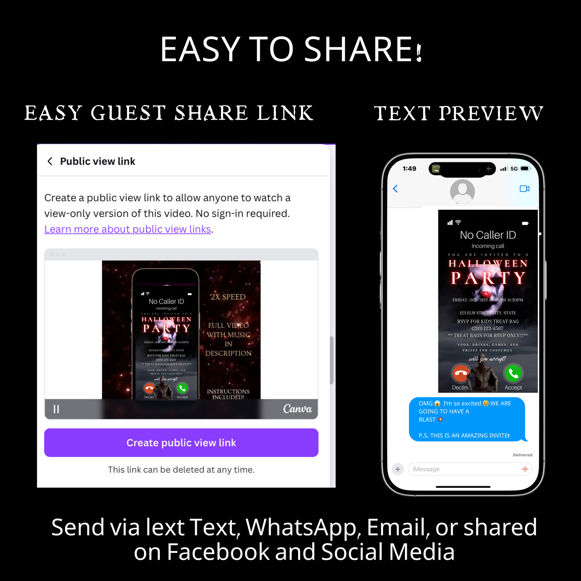 🎬 Mobile-freundliche Videoeinladung – Sofort per SMS, E-Mail, WhatsApp oder über soziale Medien versenden.