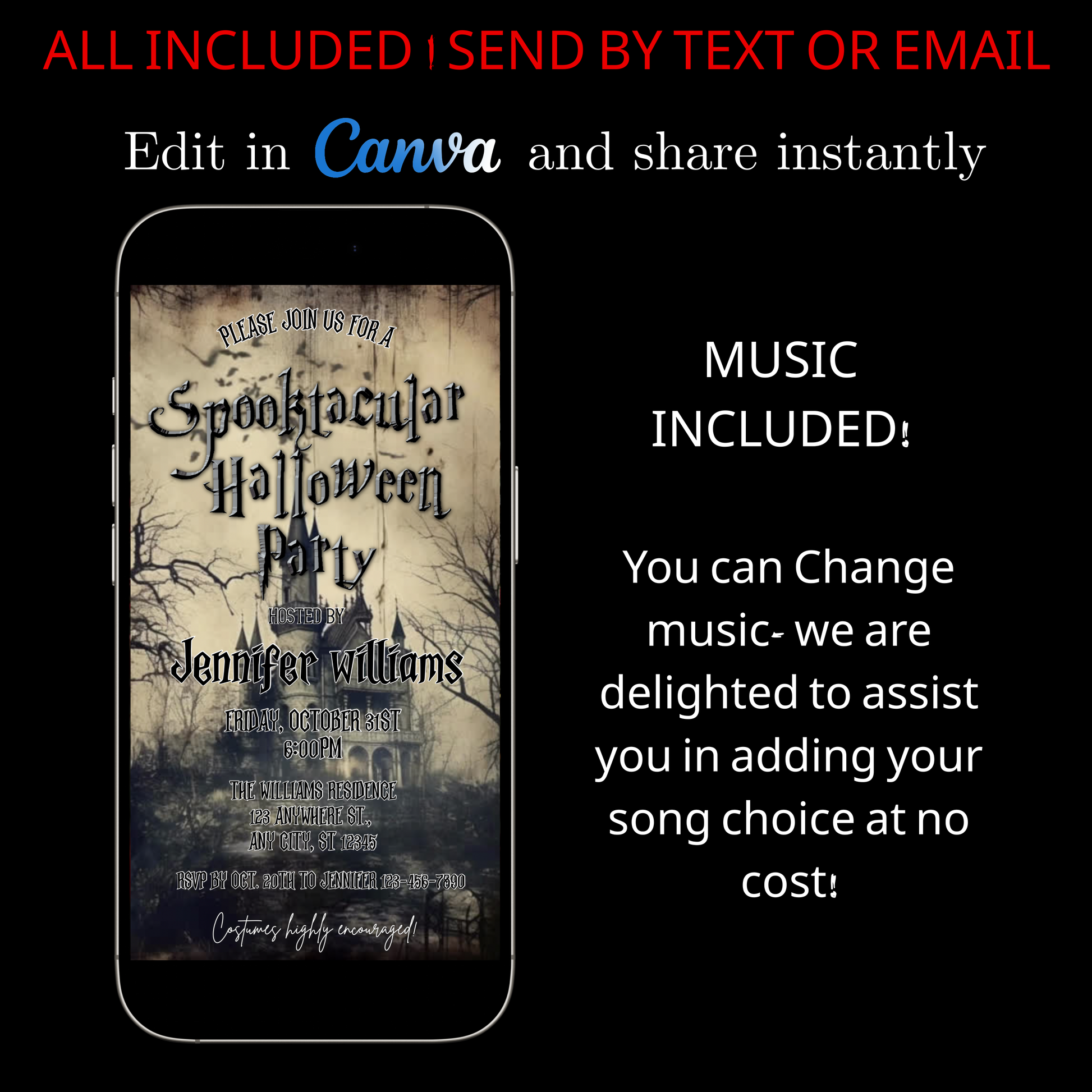 Halloween-Videoeinladung, animierte Halloween-Einladung mit Gruselmotiv, bearbeitbare mobile Einladung zur Halloween-Party