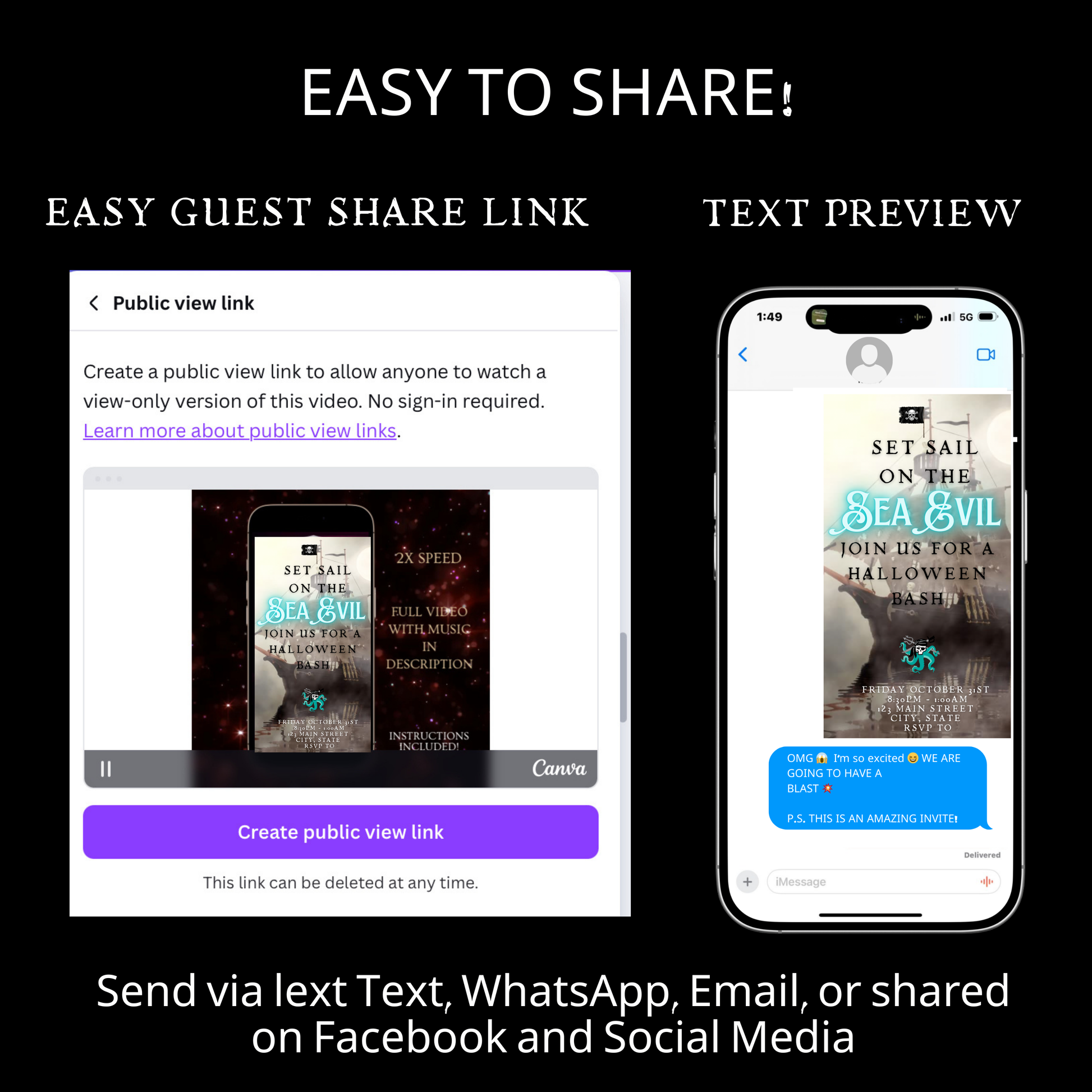 🎬 Mobile-freundliche Videoeinladung – Sofort per SMS, E-Mail, WhatsApp oder über soziale Medien versenden.
