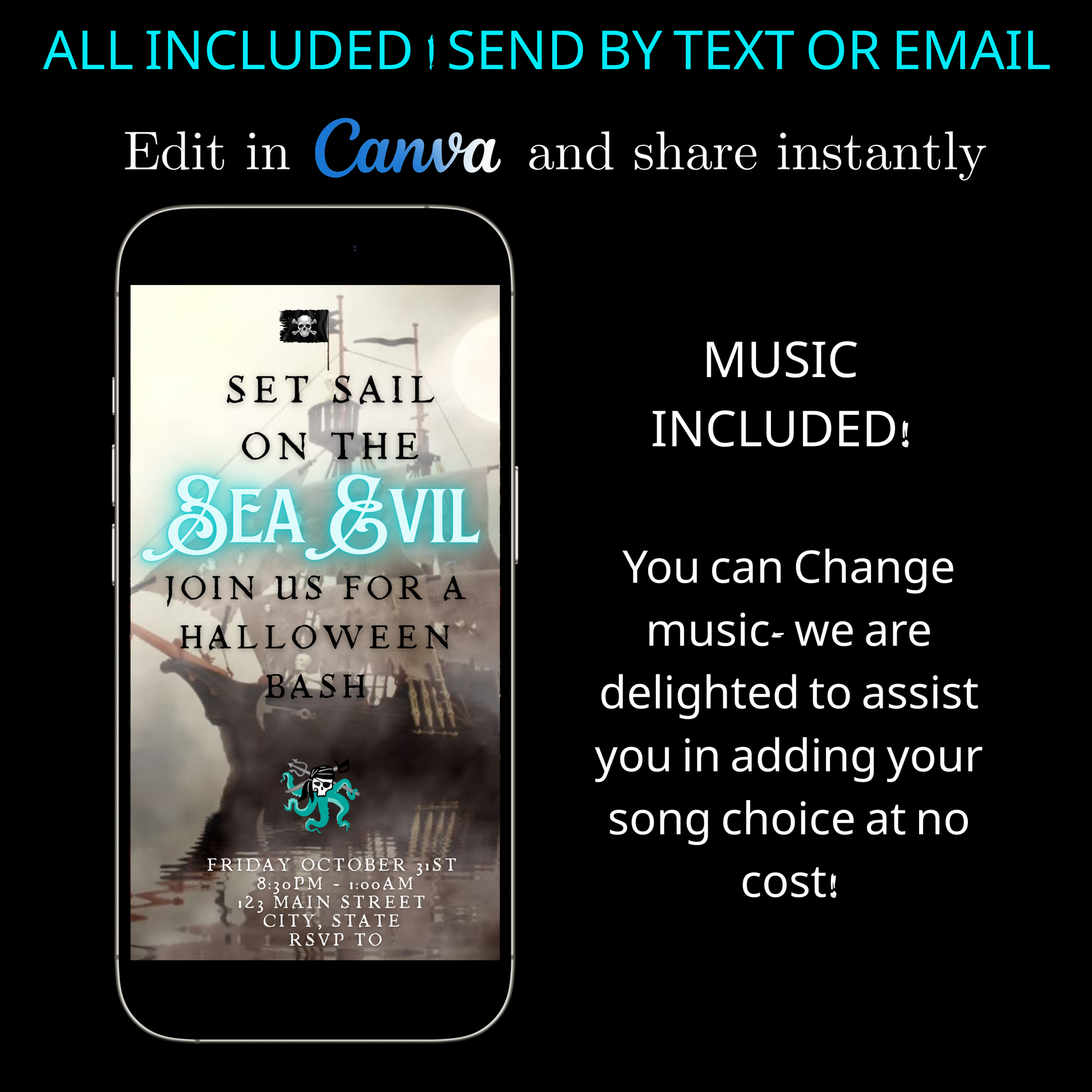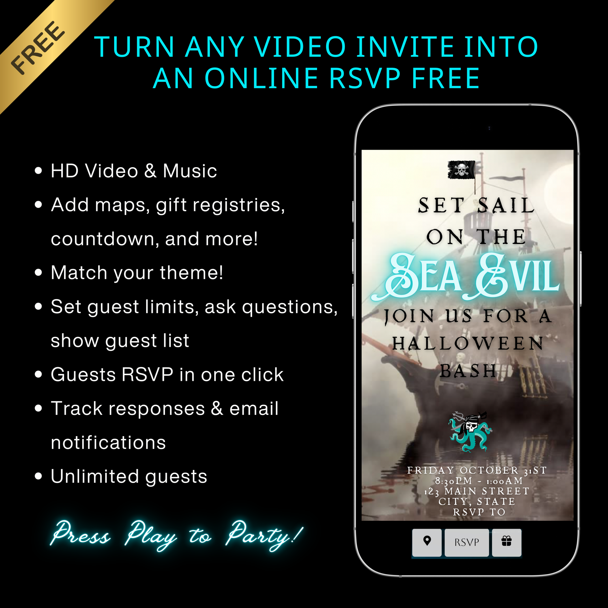 Halloween-Videoeinladung, animierte Einladung mit Geisterschiff-Motiv, bearbeitbare mobile Halloween-Party-Einladung