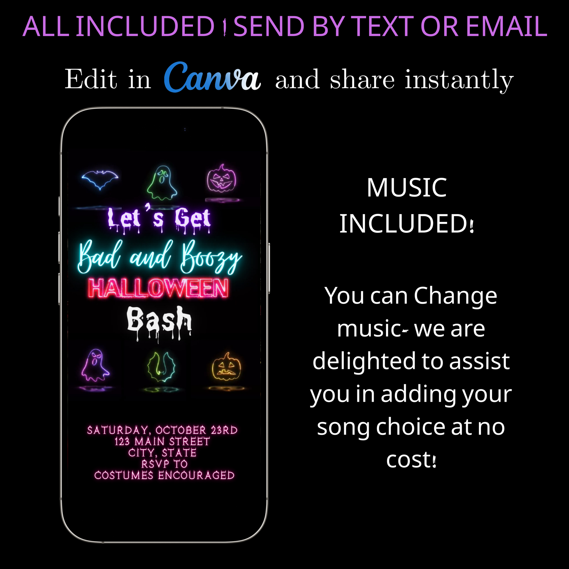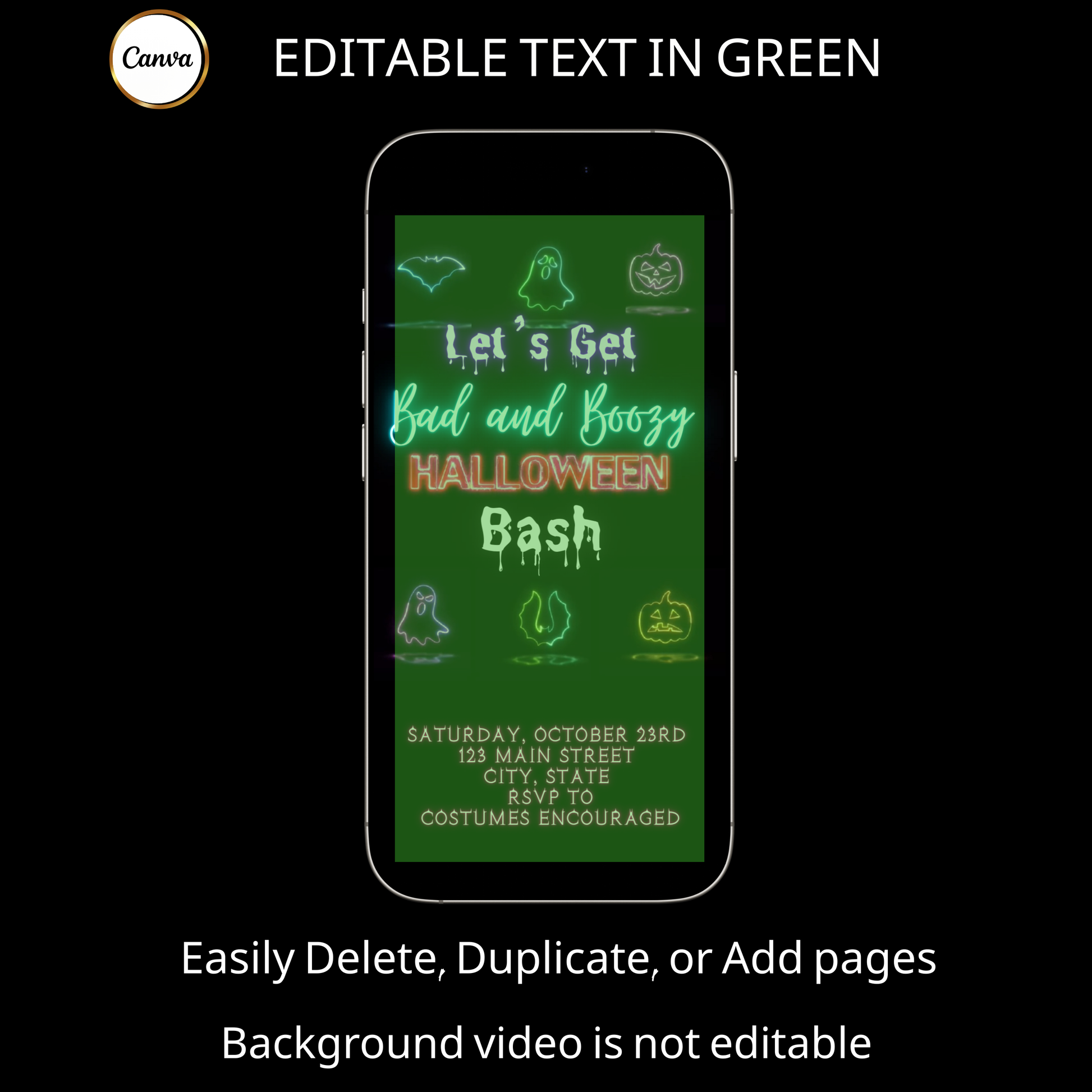 Halloween-Videoeinladung, animierte Neon-Halloween-Einladung, bearbeitbare mobile Halloween-Party-Einladung