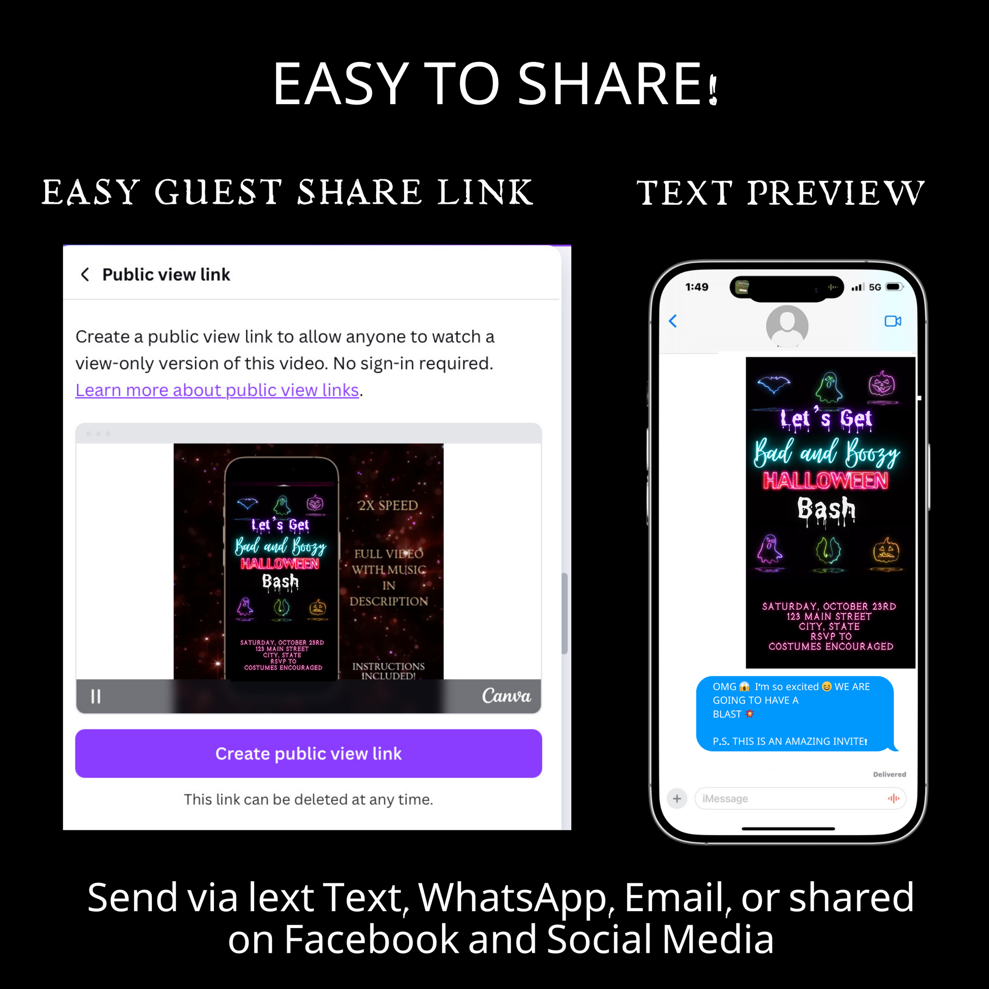 🎬 Mobile-freundliche Videoeinladung – Sofort per SMS, E-Mail, WhatsApp oder über soziale Medien versenden.