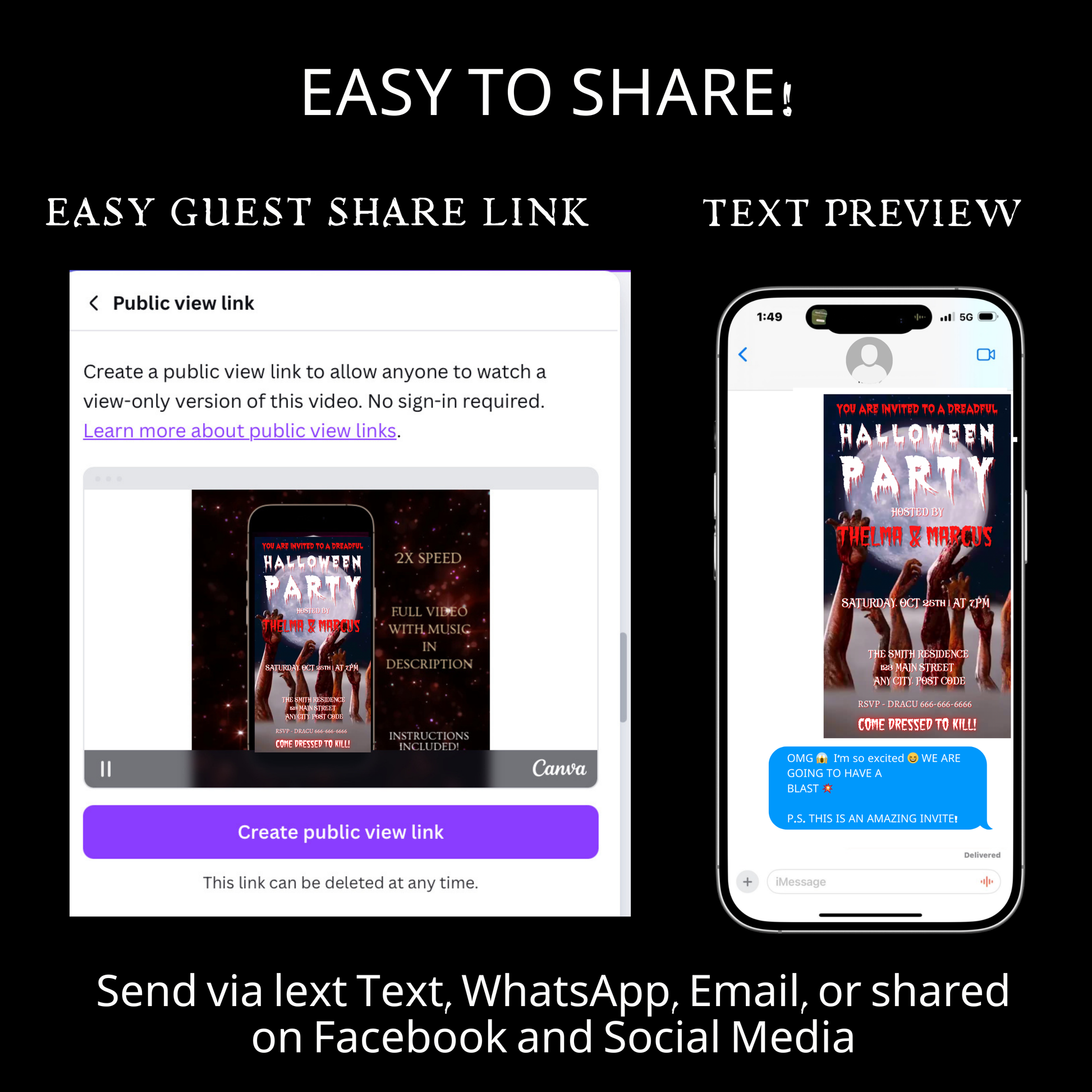 🎬 Mobile-freundliche Videoeinladung – Sofort per SMS, E-Mail, WhatsApp oder über soziale Medien versenden.