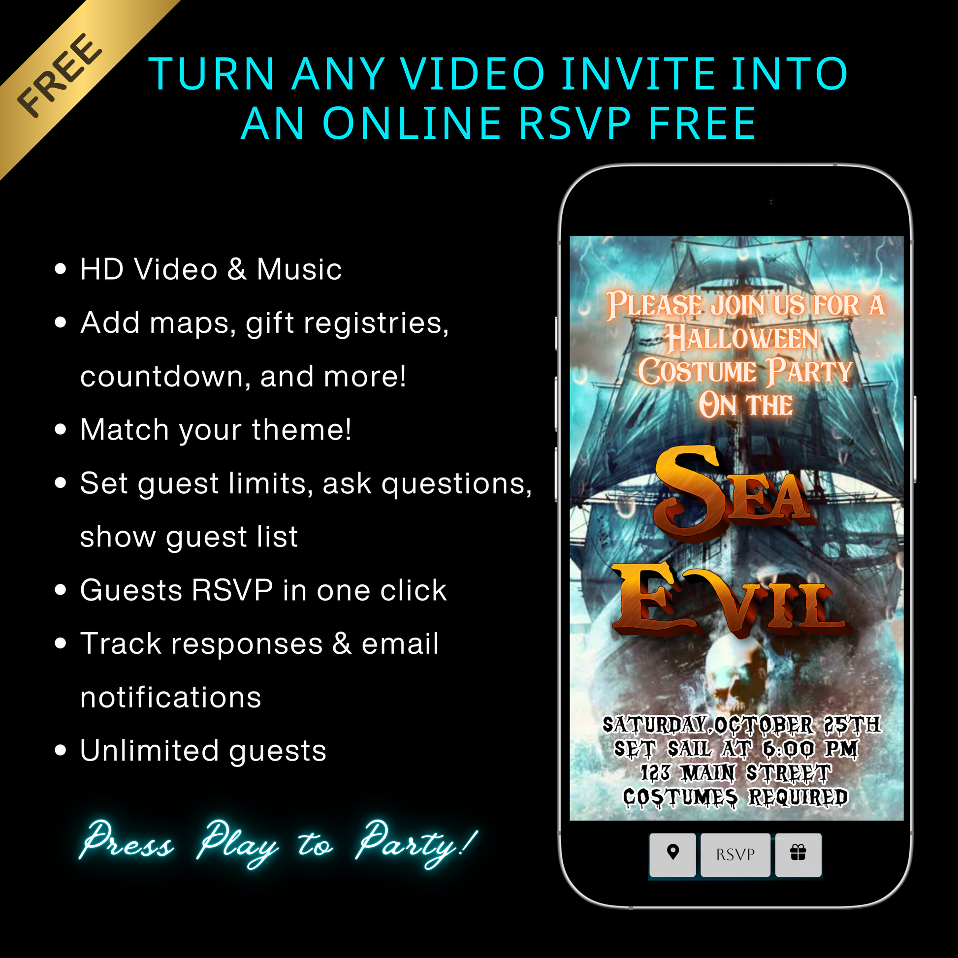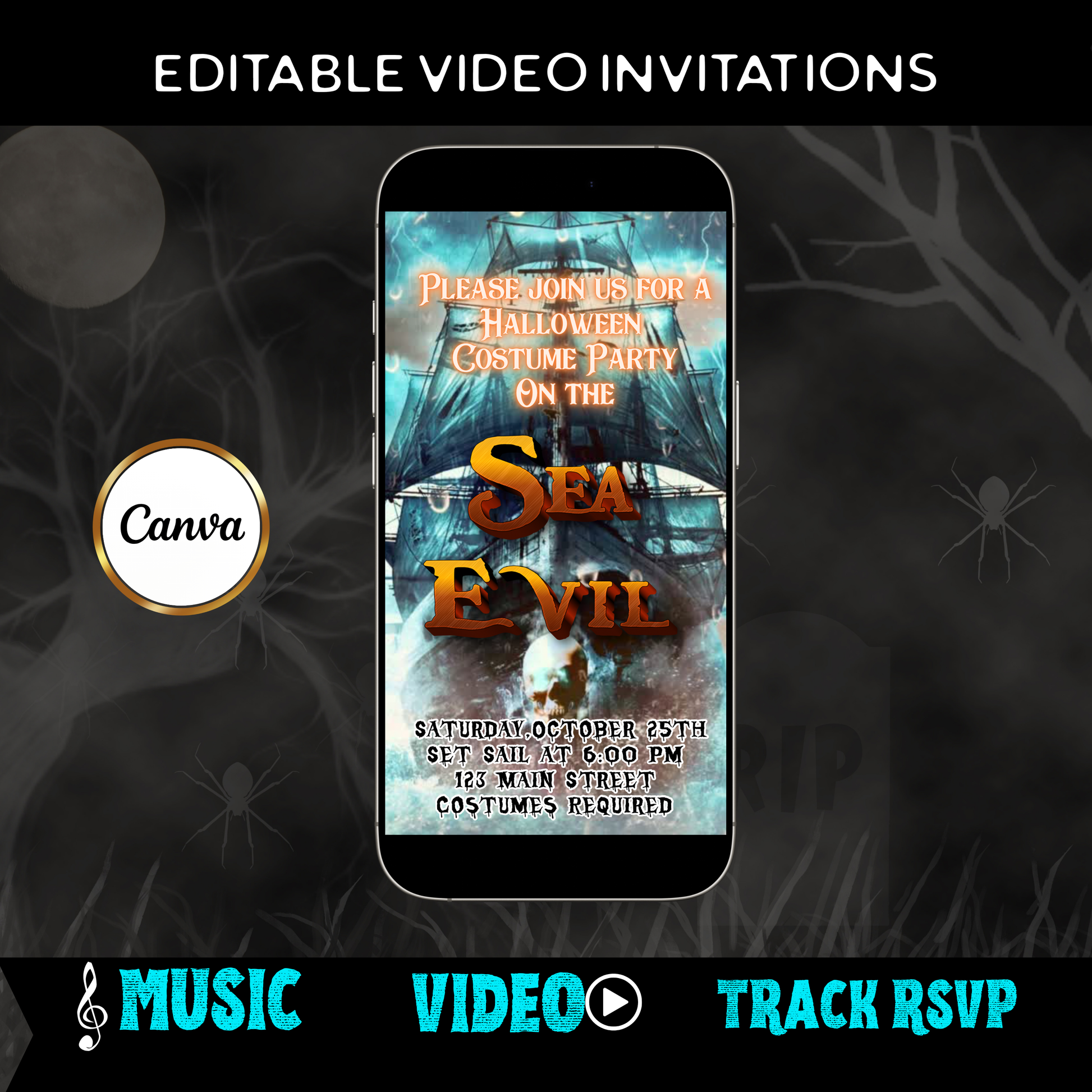 Halloween-Videoeinladung, animierte Einladung mit einem unheimlichen Seeschiff, bearbeitbare mobile Halloween-Partyeinladung