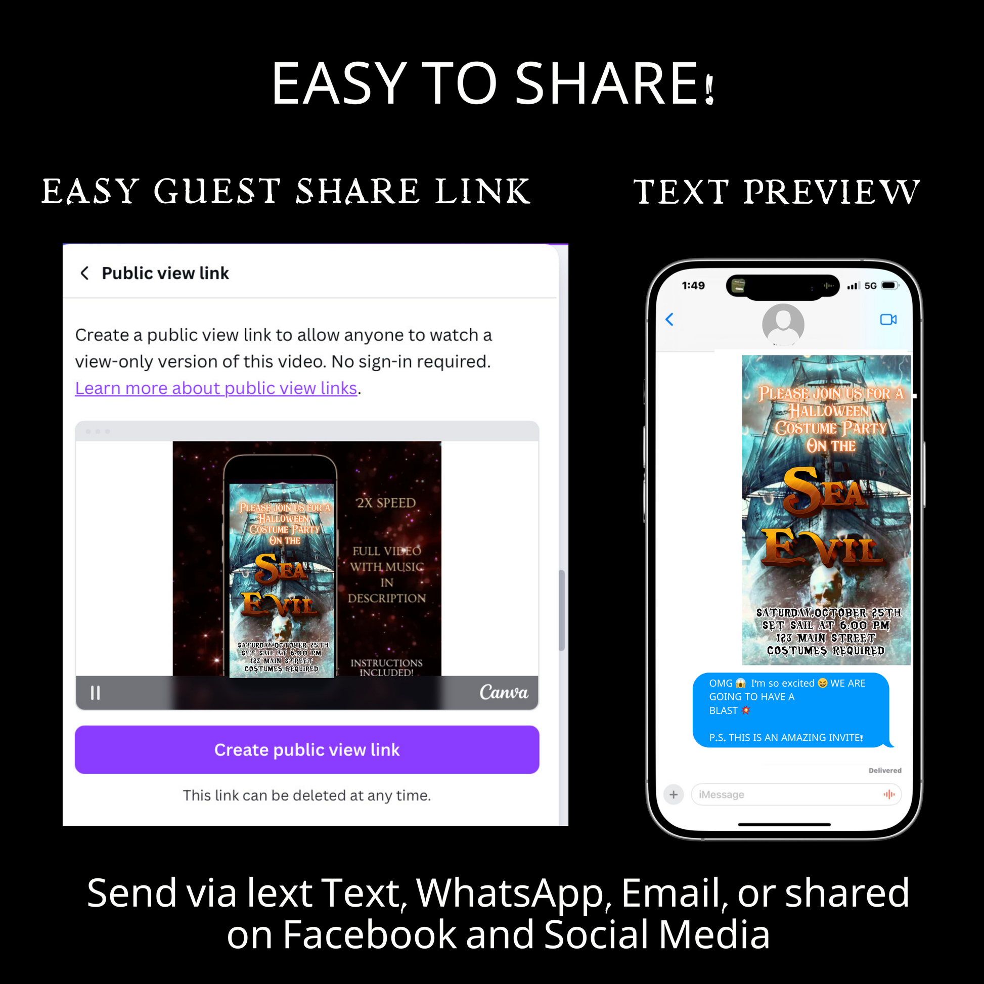 🎬 Mobile-freundliche Videoeinladung – Sofort per SMS, E-Mail, WhatsApp oder über soziale Medien versenden.