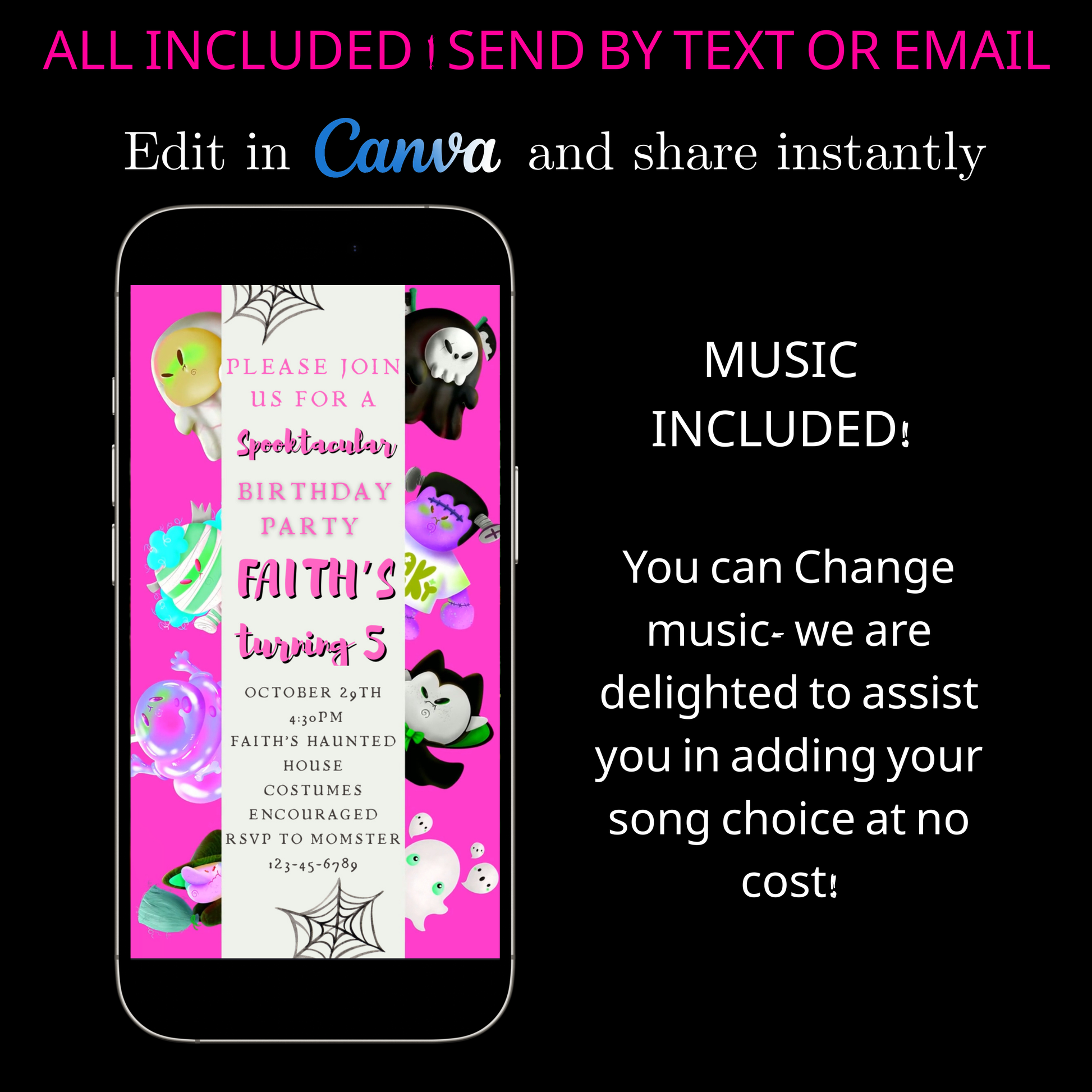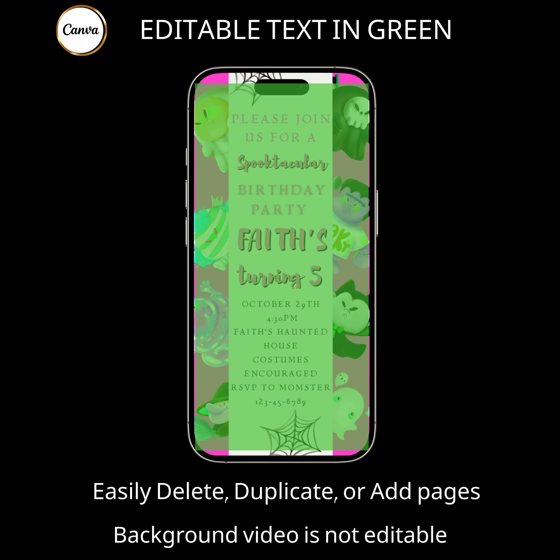 Halloween-Videoeinladung, animierte Einladung „Pink Little Monsters“, bearbeitbare mobile Einladung zur Halloween-Party