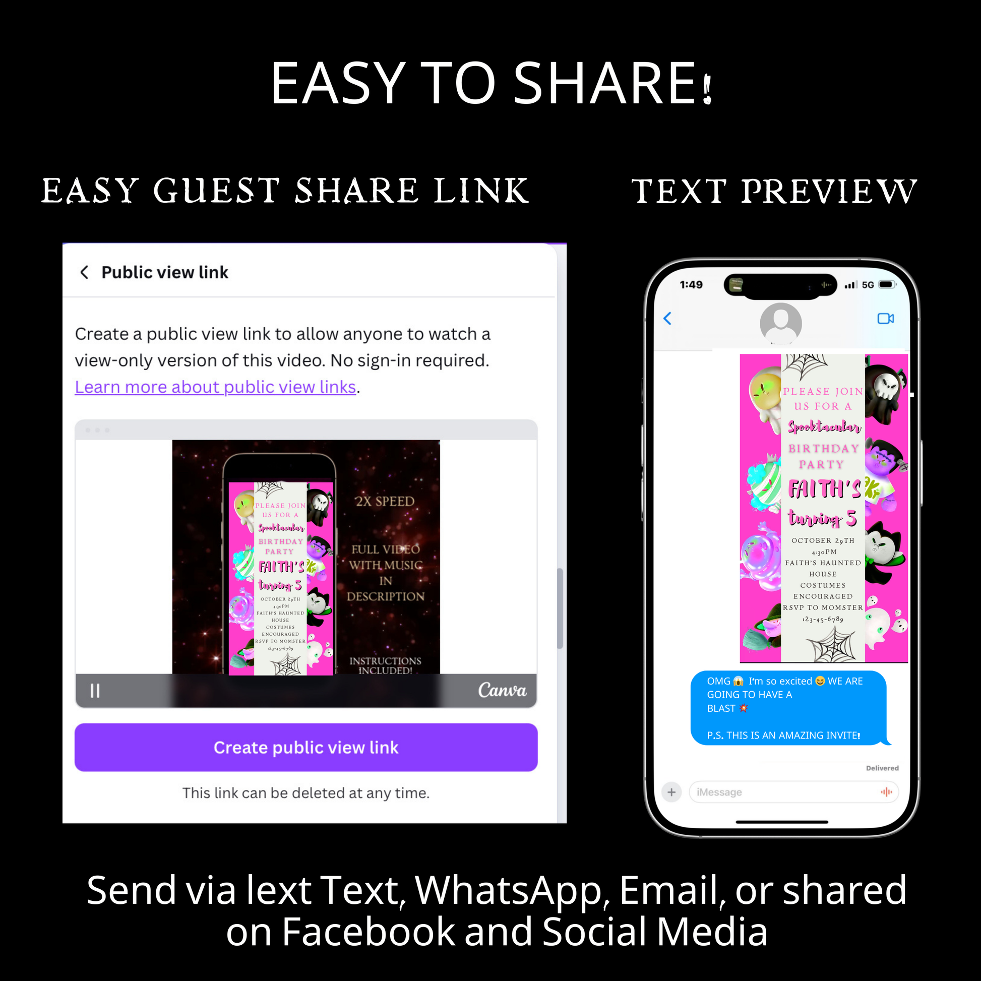 🎬 Mobile-freundliche Videoeinladung – Sofort per SMS, E-Mail, WhatsApp oder über soziale Medien versenden.