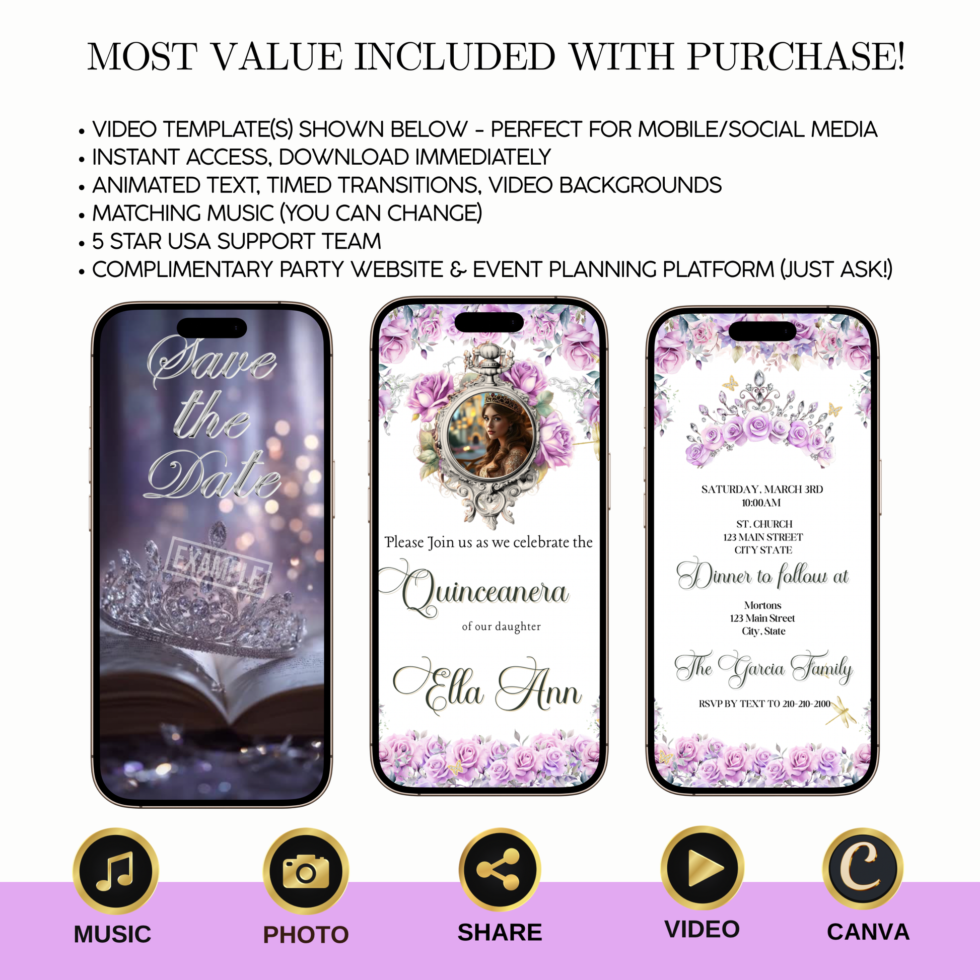 Lilac Quinceanera Video Invite | Animated Sweet 15 Quince Invite | Editable Canva Evite Template