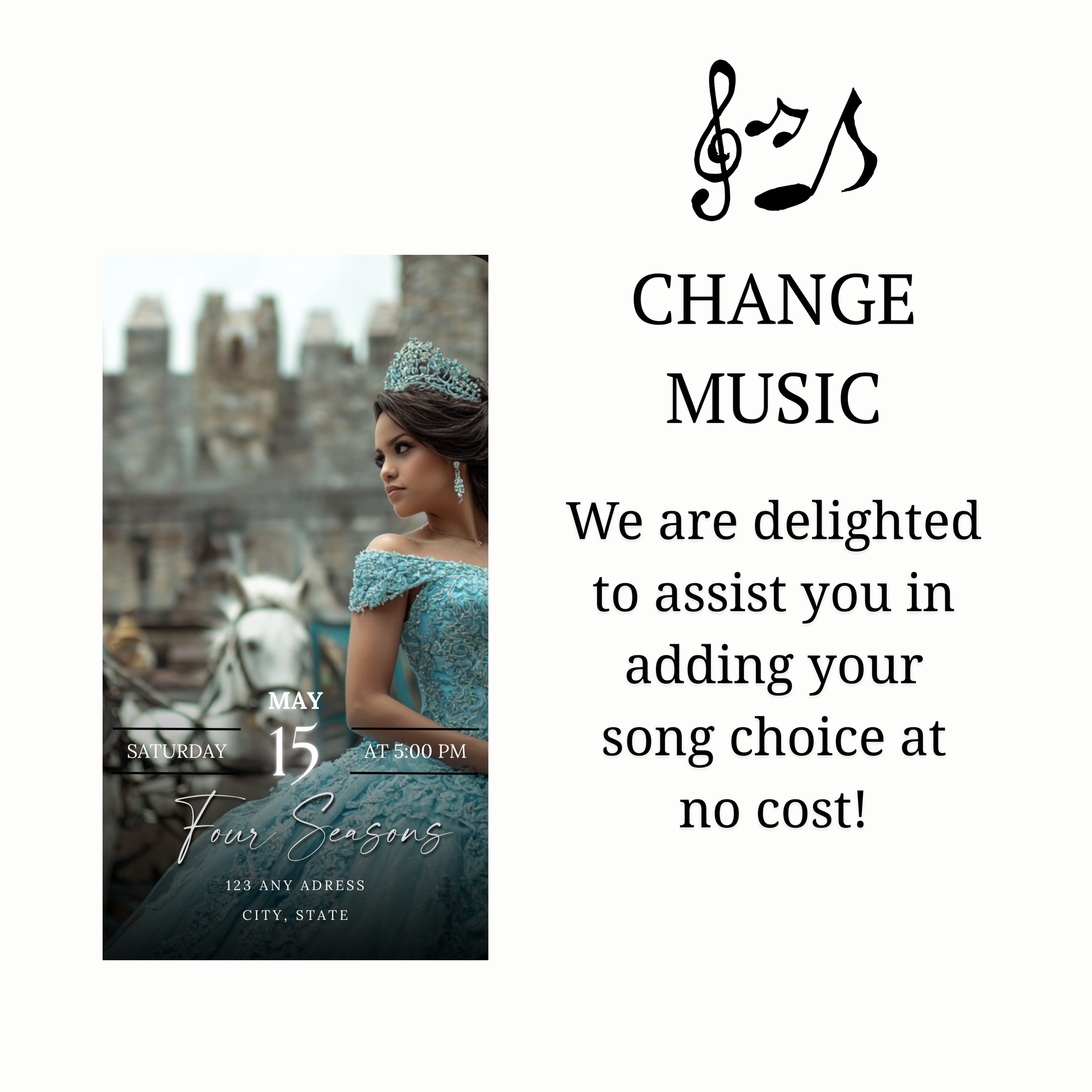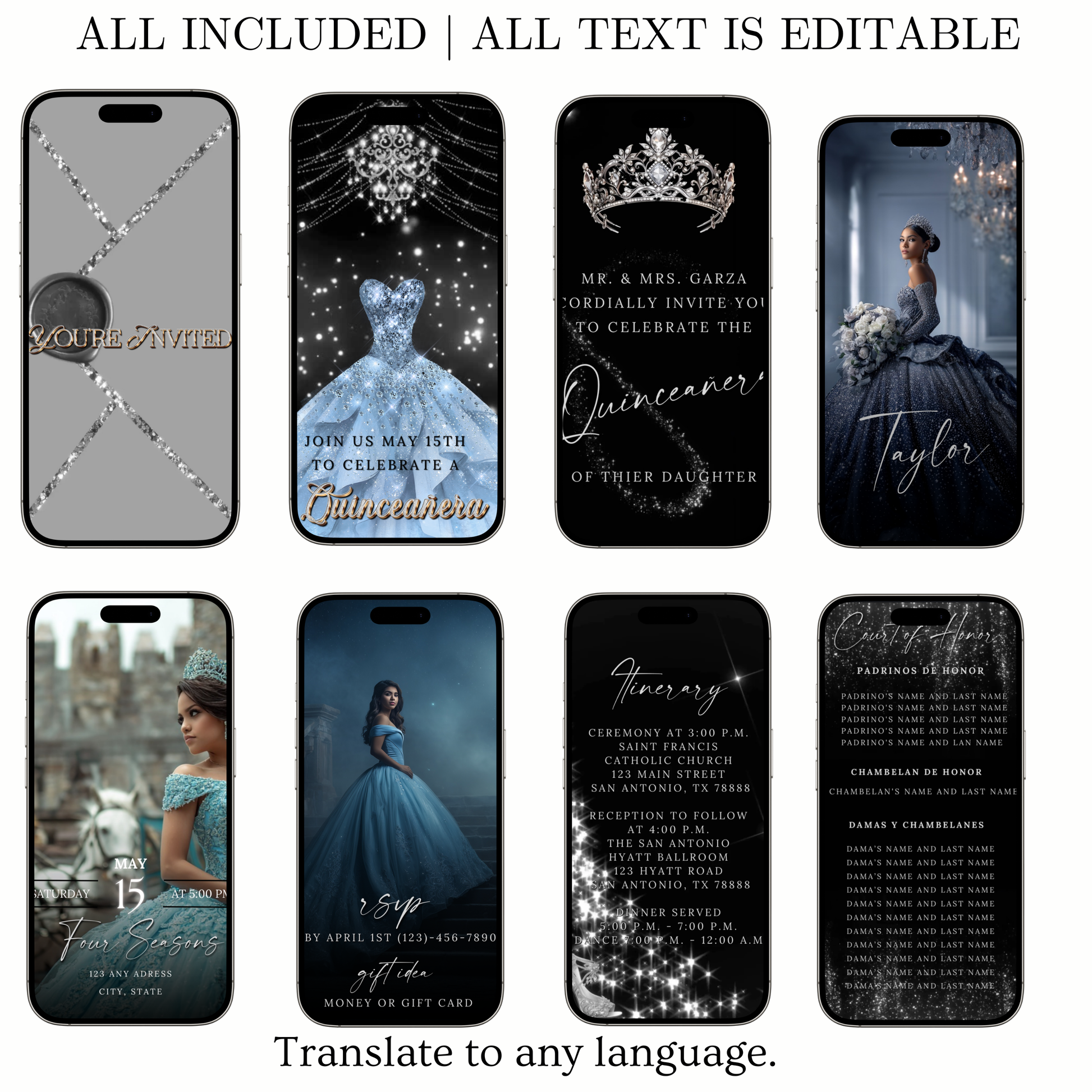This luxury blue dress and silver quinceañera video invitation transforms your event into an experience your guests will feel the moment they open it. Designed with a sparkling princess gown, chandelier details, and cinematic motion, this invitation sets the tone for a truly elegant celebration.