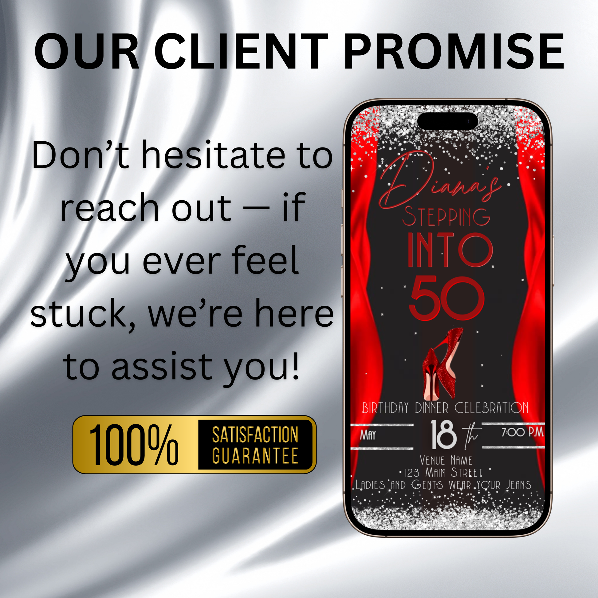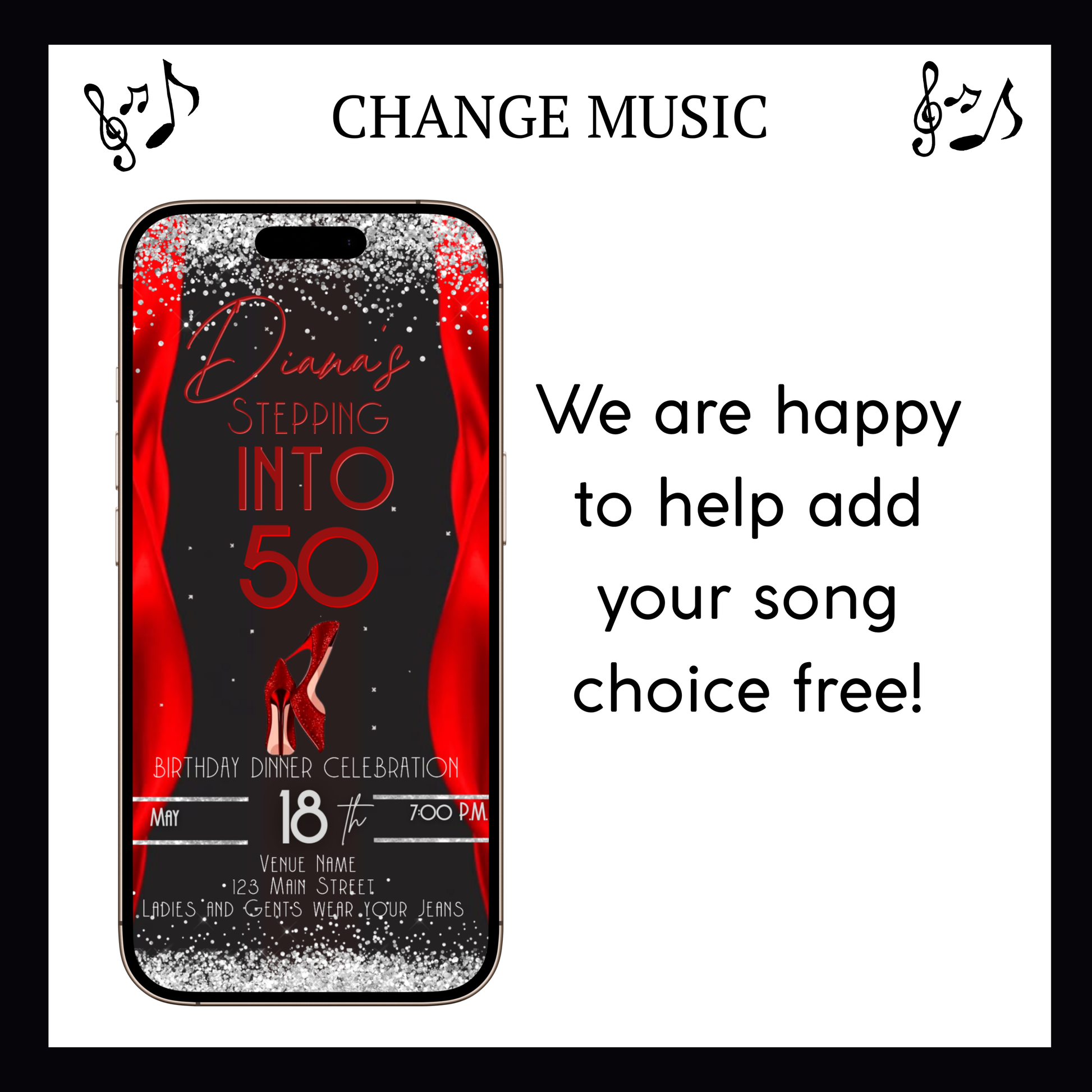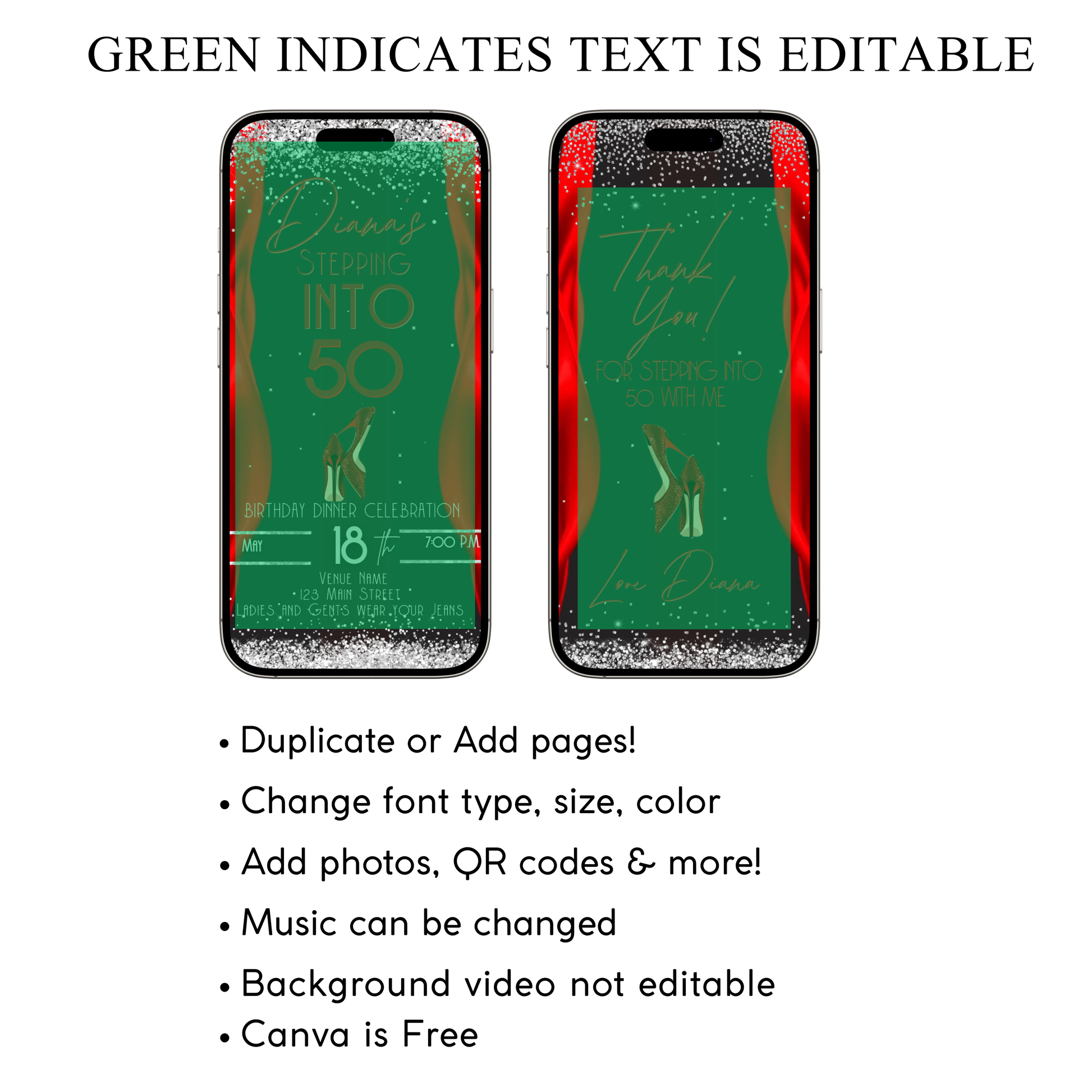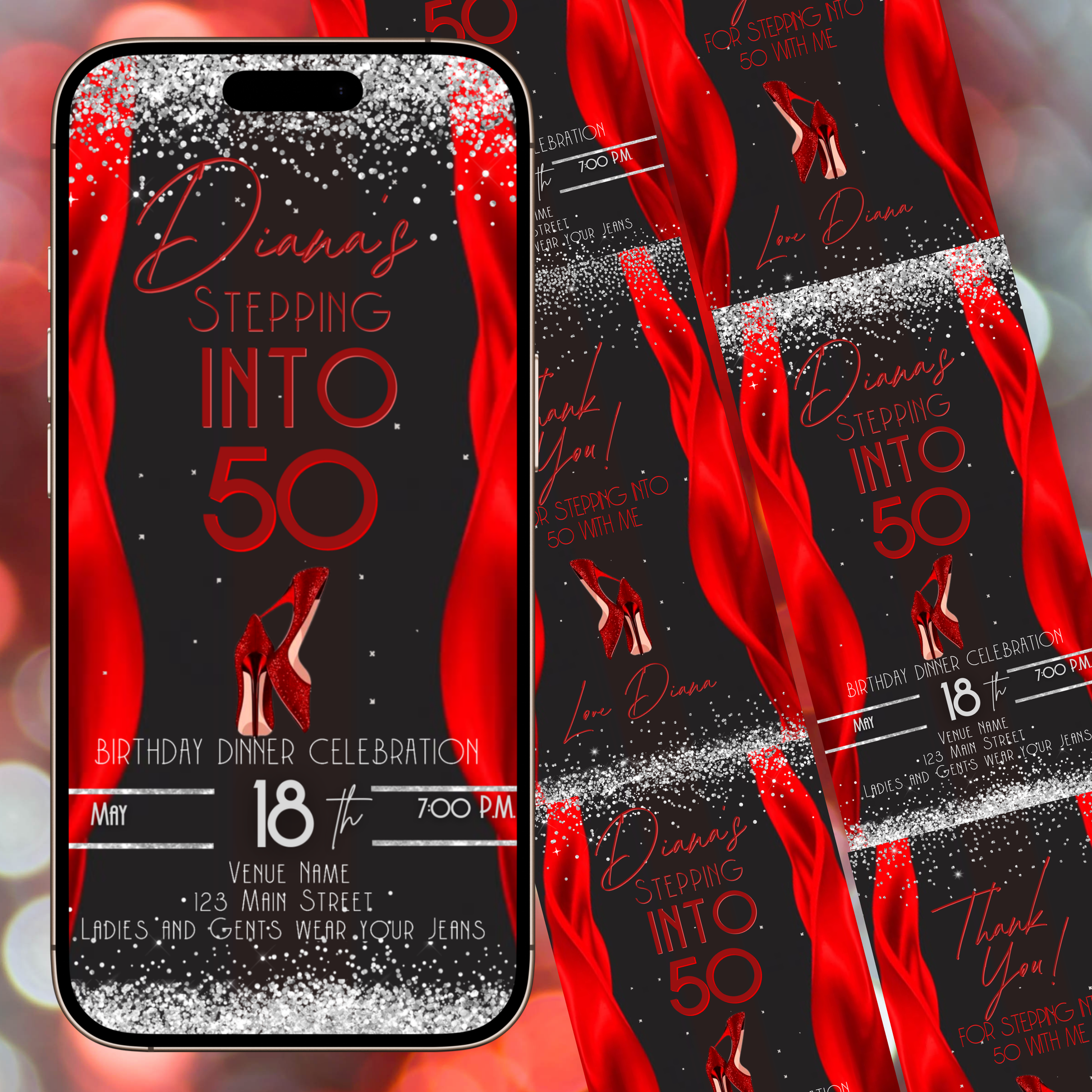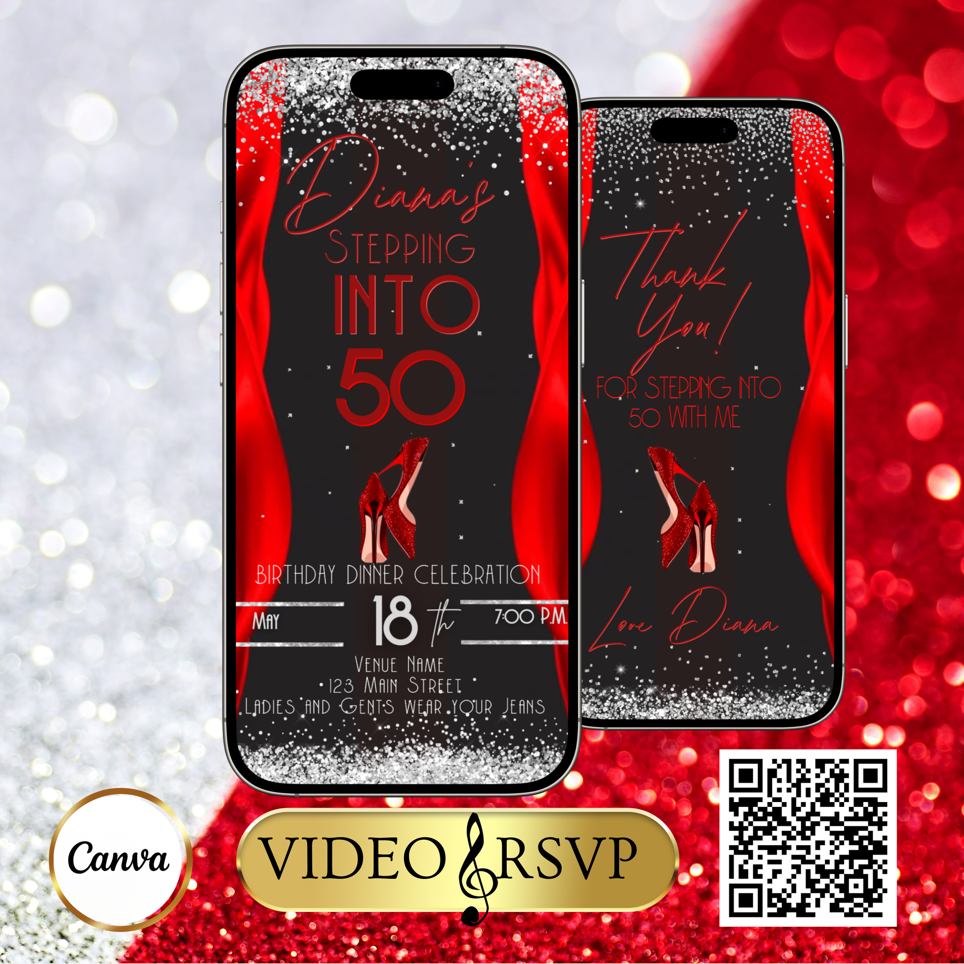 Make a dazzling entrance with this stepping in invite editable video template with Red High heels glitter party evite – the perfect way to celebrate turning 40, 50, 60, 70, 80 or any age or stepping into your birthday with style. Featuring sparkling glitter and a fierce high heel motif, this editable Canva video invitation lets you customize every detail and share it instantly.