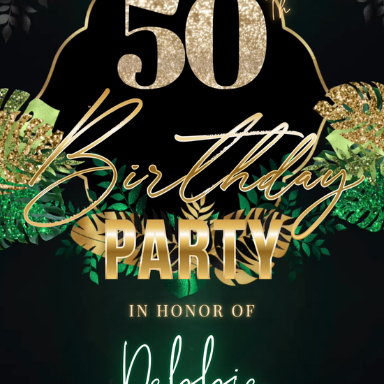 Videoeinladung zum 50. Geburtstag in tropischem Grün und Gold – Bearbeitbare animierte Canva-Einladung