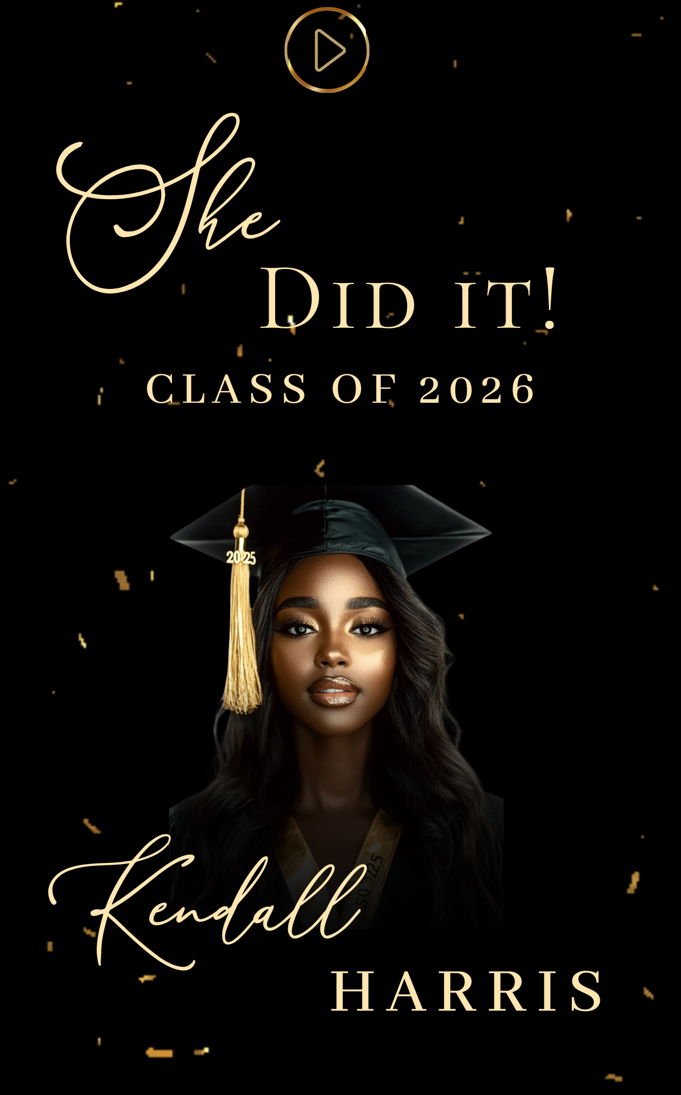 This Class of 2026 graduation invite editable video template animated announcement is perfect for celebrating this special milestone in black and gold elegance. Host the ultimate Graduation Party to celebrate your grads’ accomplishments! Inspired by black and gold modern style, this graduation invitation and announcement adds a classic touch to your celebration.