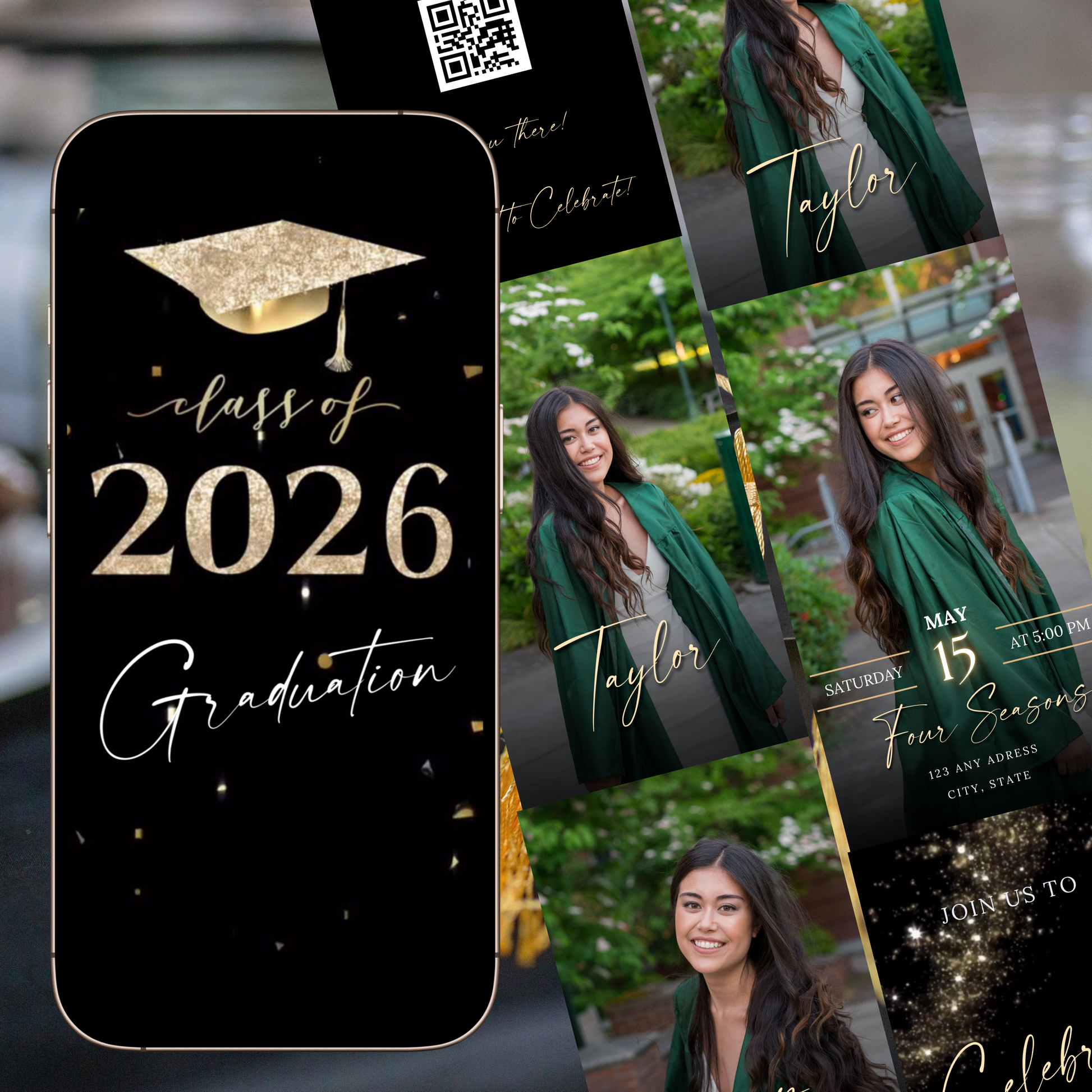 2026 Graduation Party Video Invitation | Digital Gold Graduation Invite | Editable Online RSVP Evite Canva Template