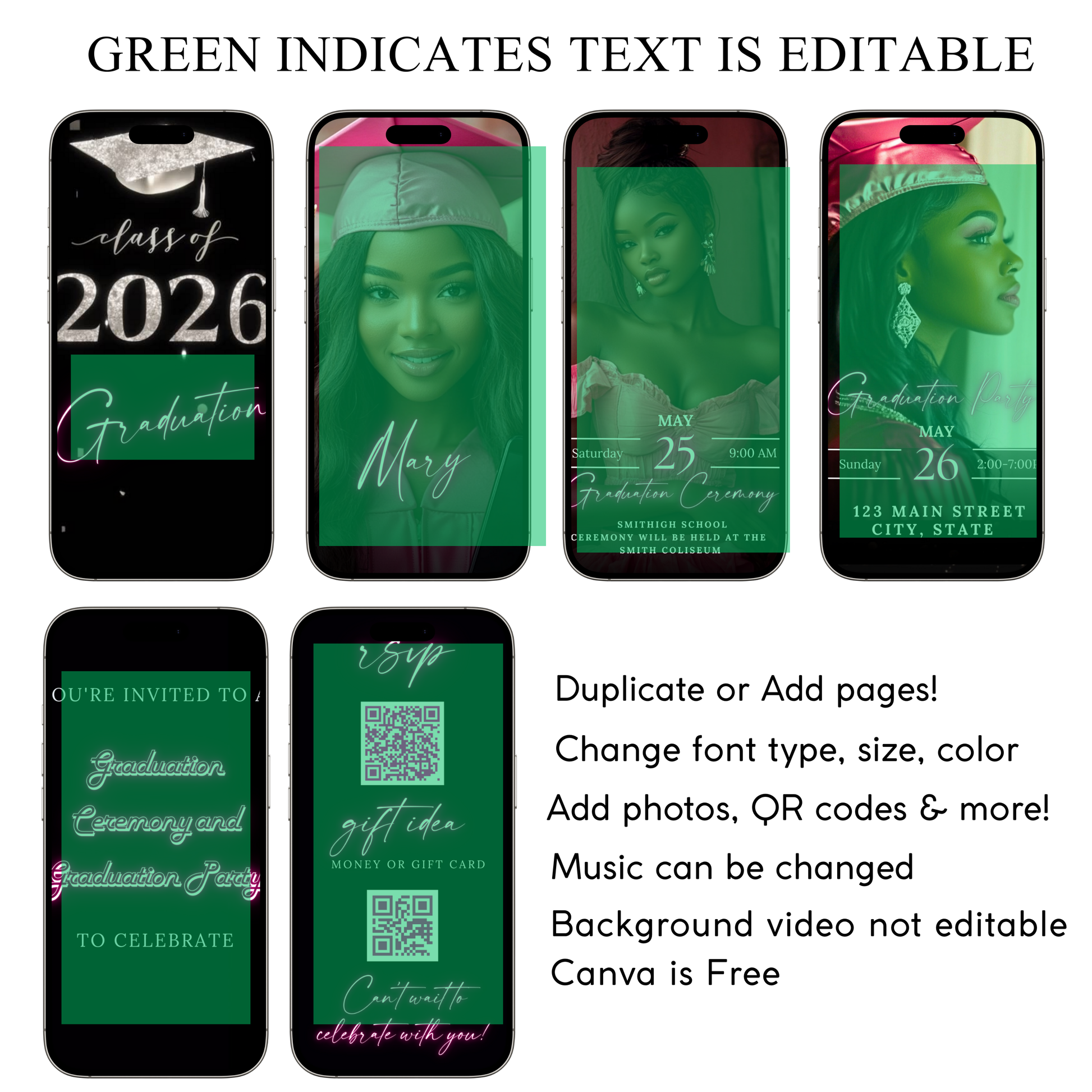 2026 Graduation Party Video Invitation | Digital Pink Graduation Invite | Editable Online RSVP Evite Canva Template