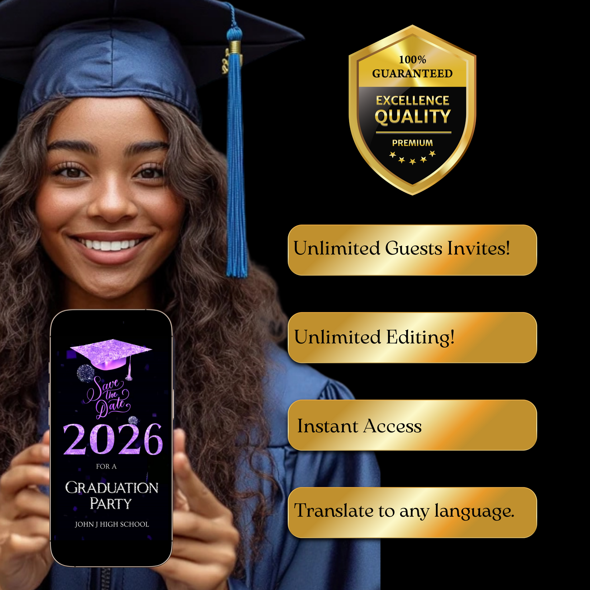 - Fully editable text fields for name, class year, date, time, and RSVP