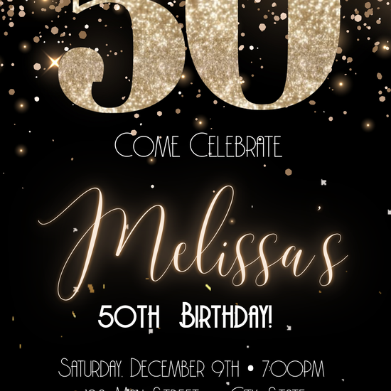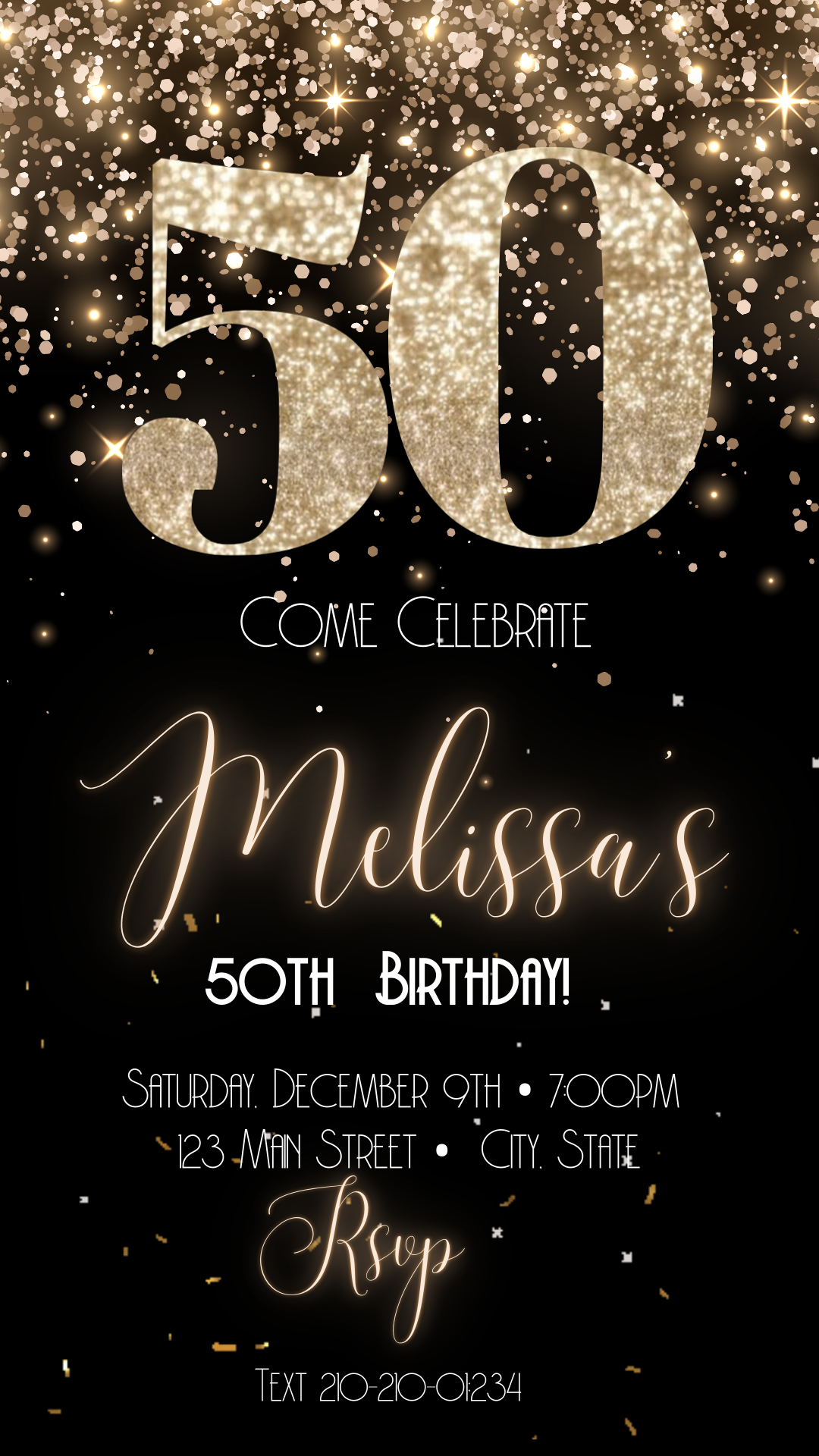 • Editable animated video invitation with a gold glam 50th glitter theme