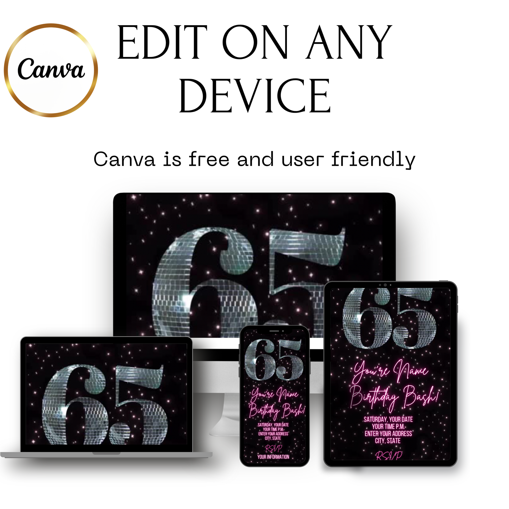 65th Birthday Disco Video Invitation | Digital Retro Party Invite | Editable Canva Template