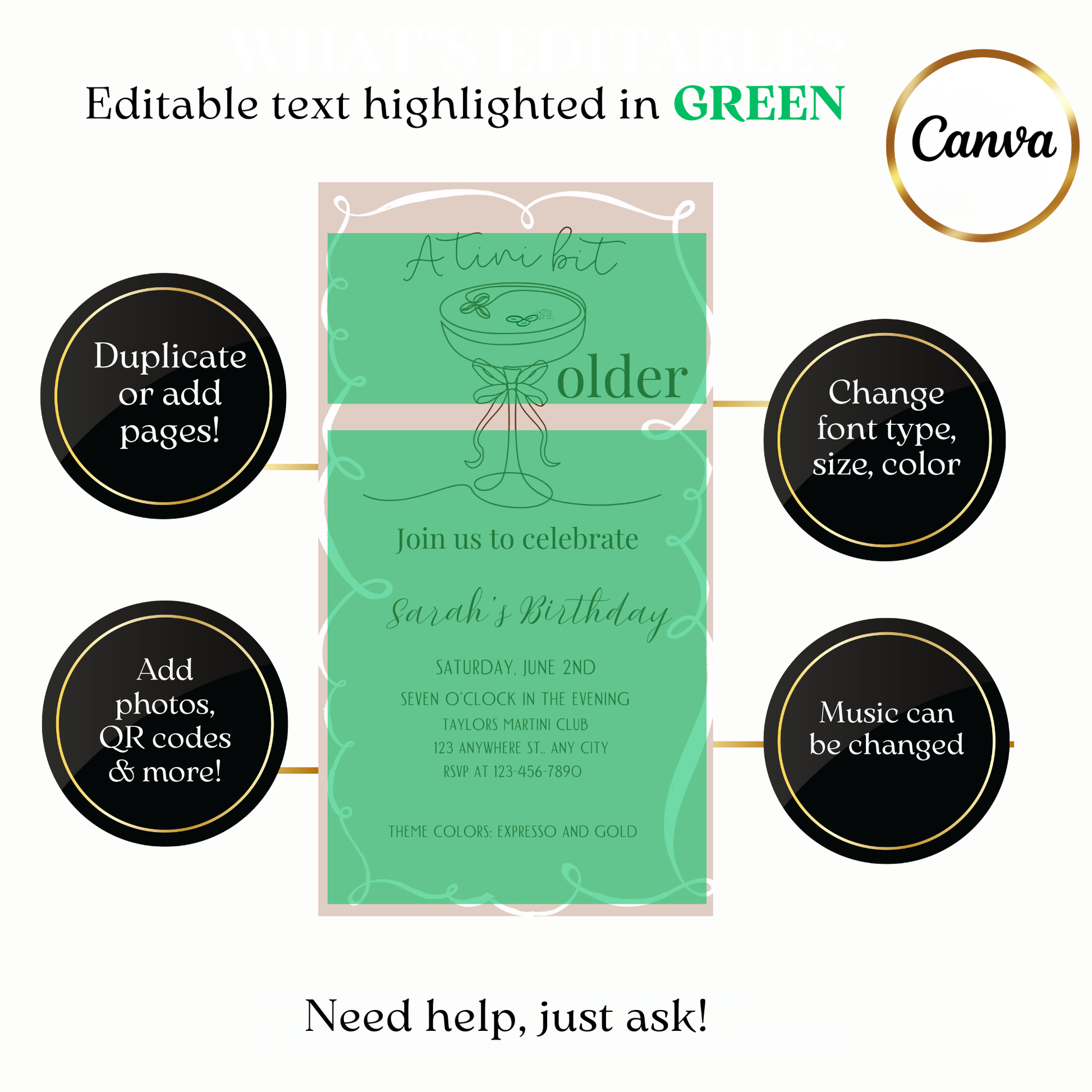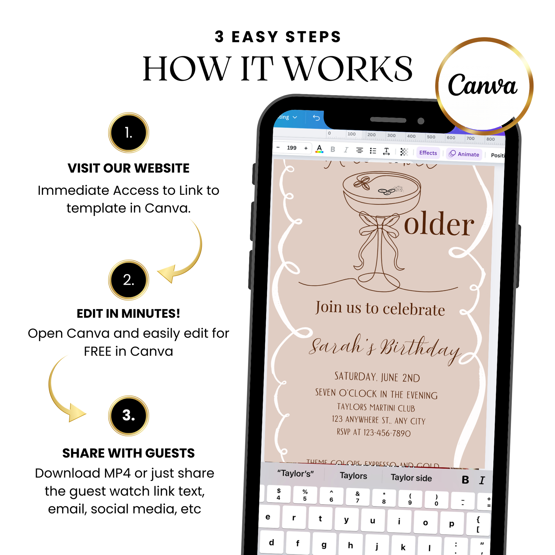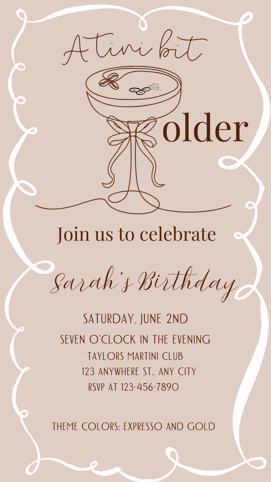 Celebrate “A Tini Bit Older” in style with this editable expressomartini-themed video invitation! Personalize easily in Canva and share instantly with friends.