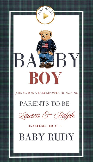 Digital Ralph Lauren Polo teddy bear baby shower invitation website featuring a classic green plaid background and gold rocking horse and an adorable bear. Elegant typography Perfect preppy plaid baby shower invite for boys or gender-neutral celebrations.