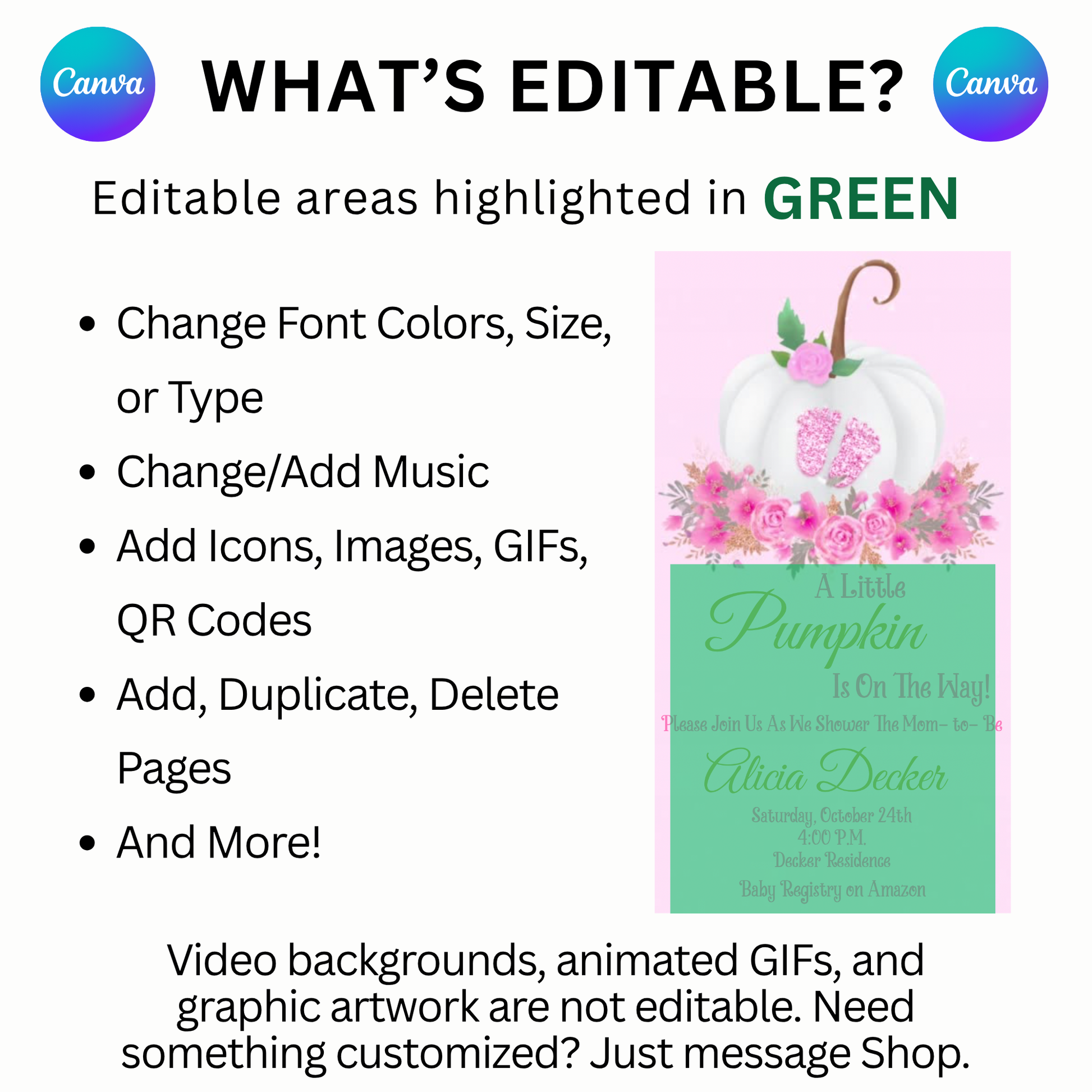 This editable fall pumpkin video invitation is designed to wow your guests and get them excited for your special event. With animated effects and music (that you can customize!), it’s the perfect way to set the tone for a baby shower. This animated video invitation template is fully customizable through the user-friendly Canva platform.