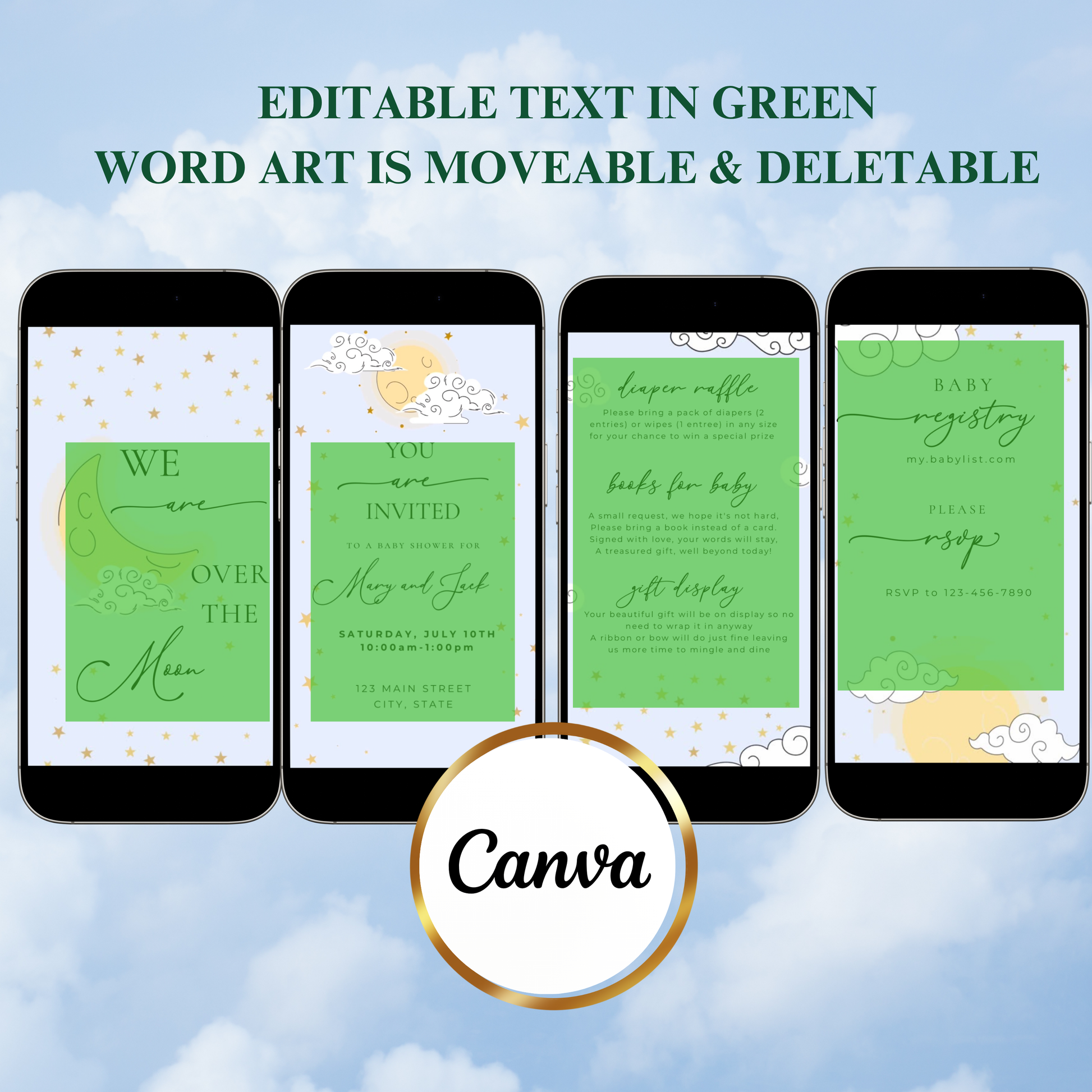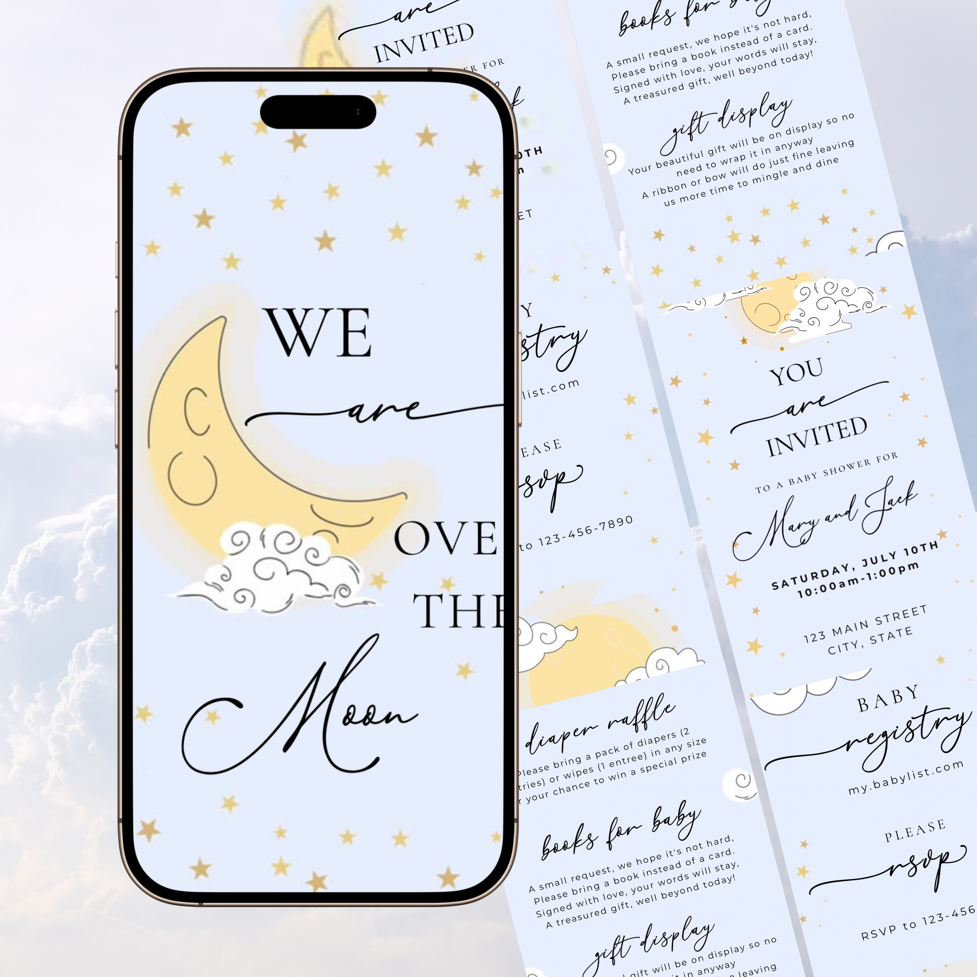 Celebrate your little star on the way with this dreamy over the moon invite video template baby shower animated evite! Designed with soft skies, twinkling stars, and lunar charm, this video invitation is designed by an artist — we personalize it with your baby shower details, music, and optional photo. We provide all the links to send via text, email, or social media.