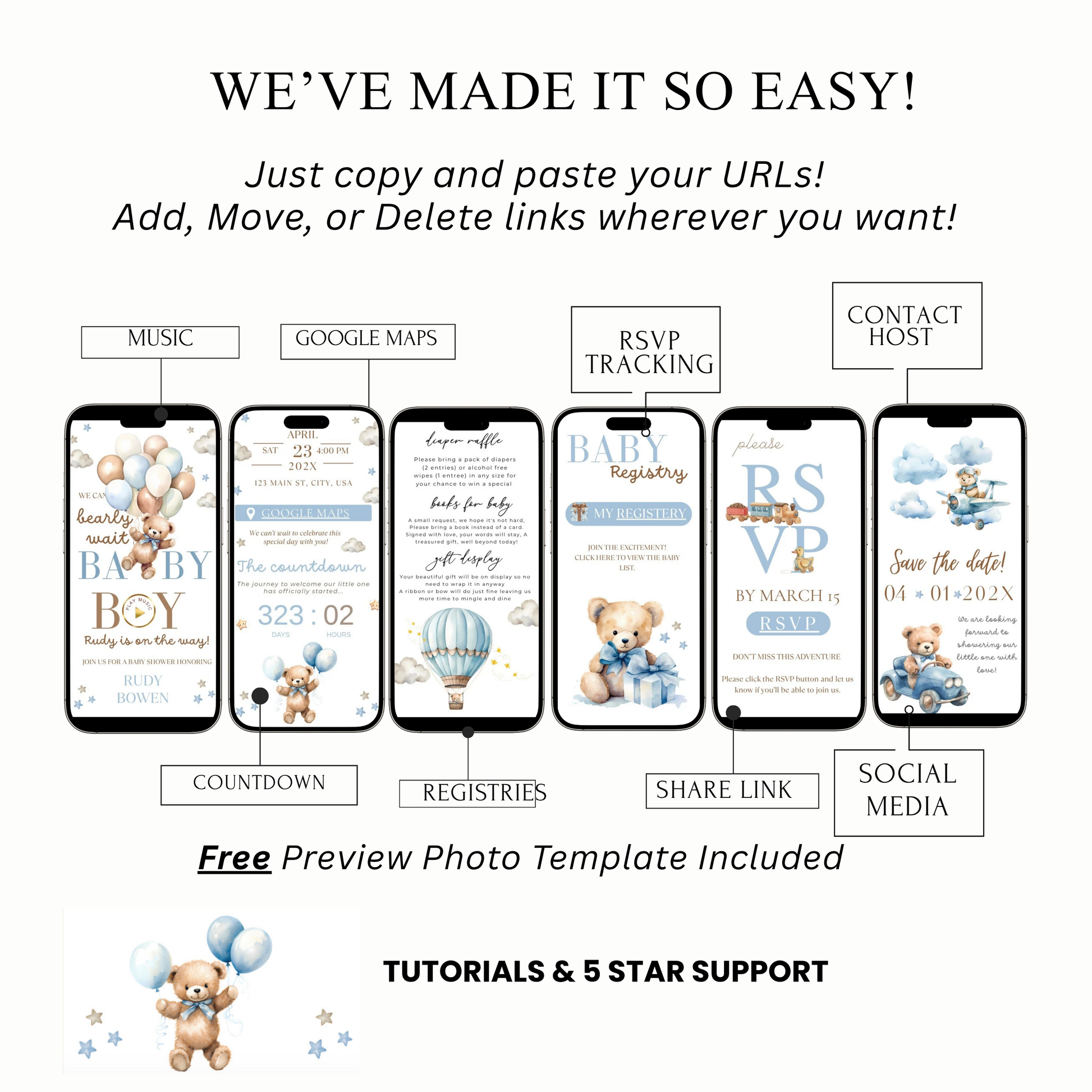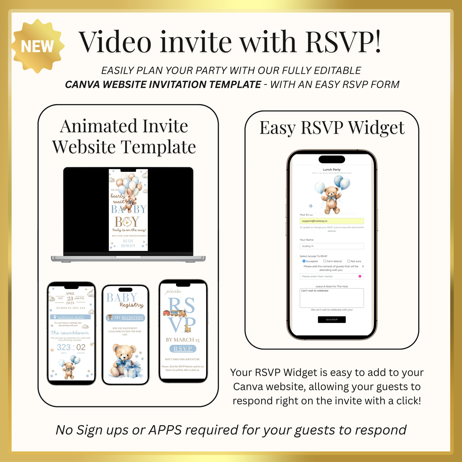 Invite your guests to Bear-themed baby shower or 1st birthday celebration with a animated mini website! It includes music, RSVP, registry, maps, and clickable links.
