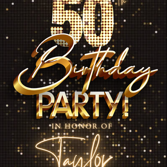Celebrate turning 50 in unforgettable style with this Black Gold Sequin 50th Birthday Video Invitation! This animated, editable Canva video invitation is designed in a mobile-first vertical format and is perfect for sharing by text, email, or social media.