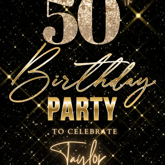 Black Gold Sparkle 50th Birthday Video Invitation – Editable Canva Animated Invite