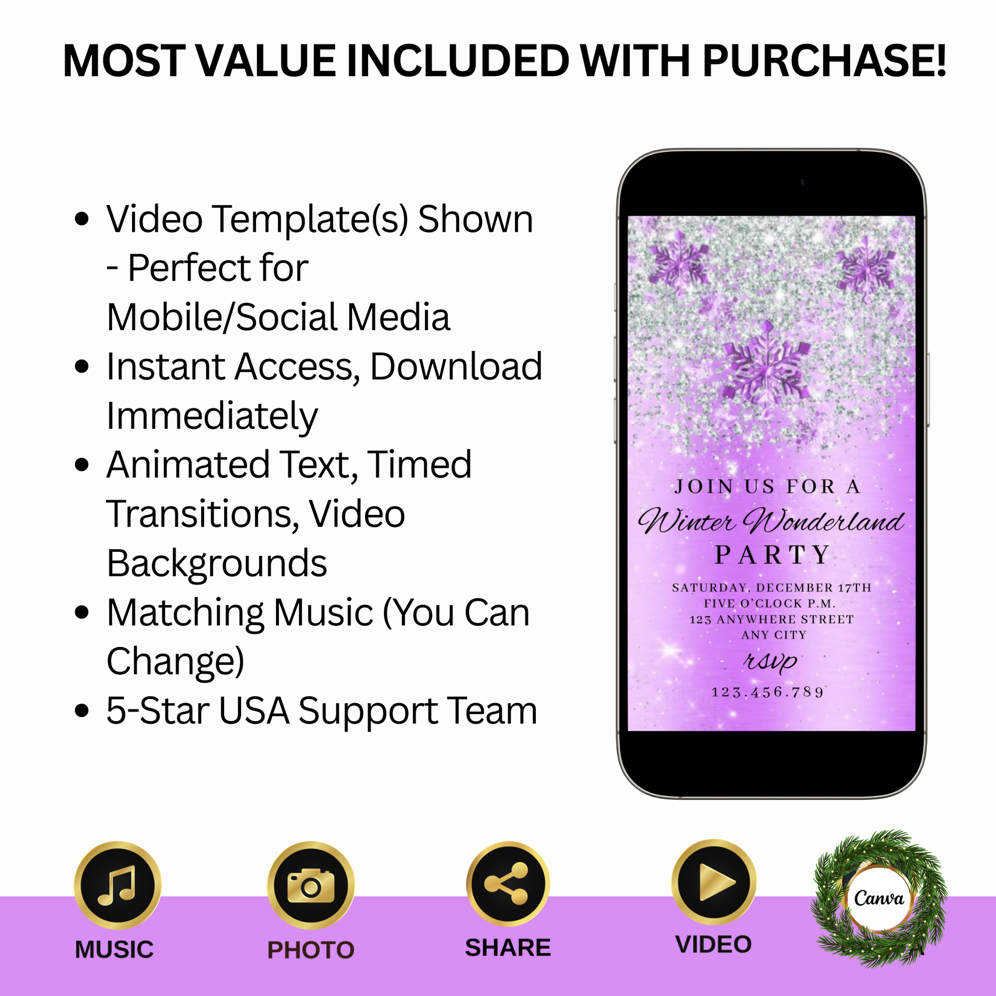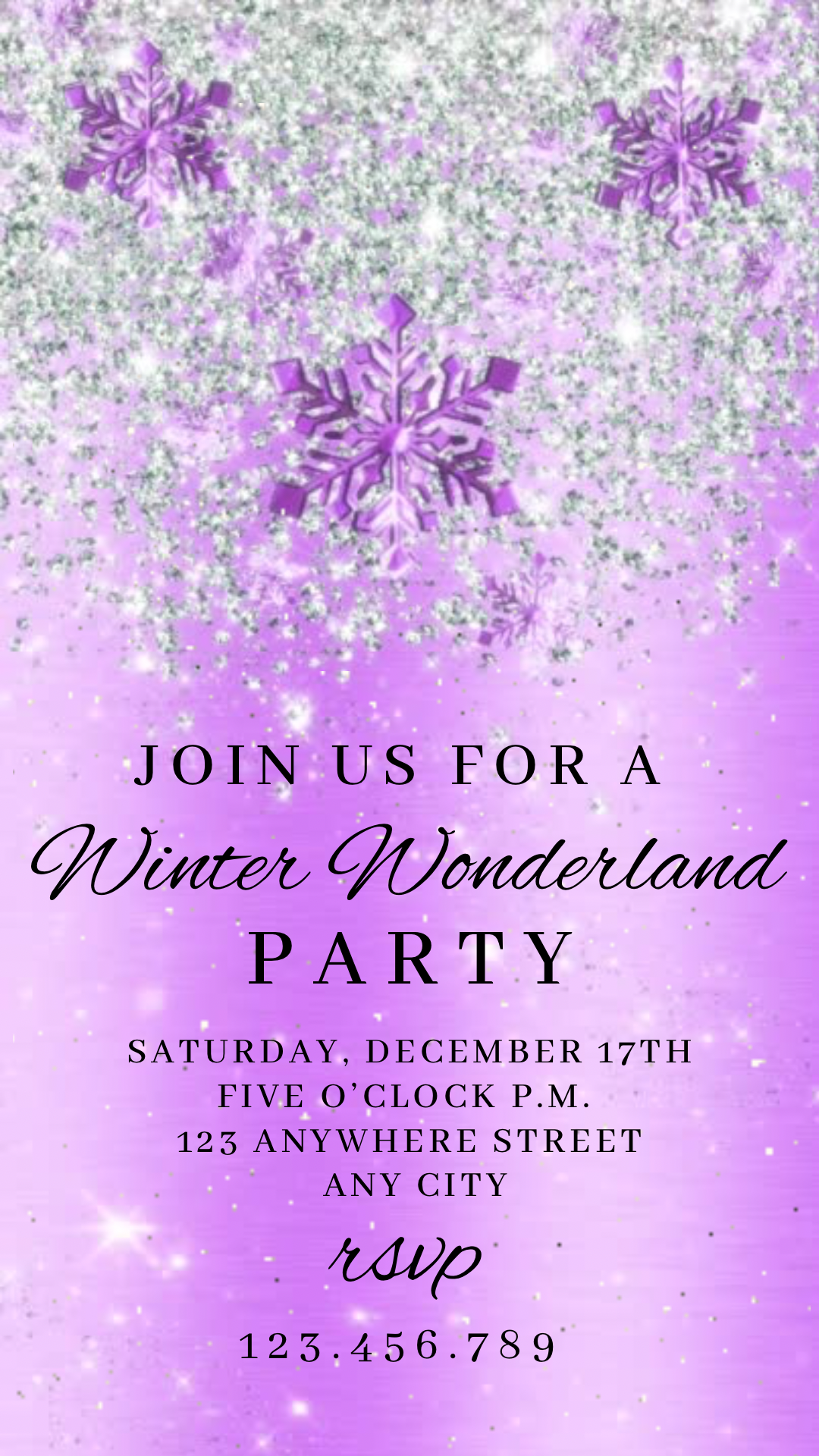Invite your guests with an Elegant Purple Snowflake holiday party video invitation! Whether you’re hosting a family Christmas party, office holiday celebration, pajama party, or a glamorous winter wonderland soirée, this editable Canva template is fun, festive, and easy to personalize.