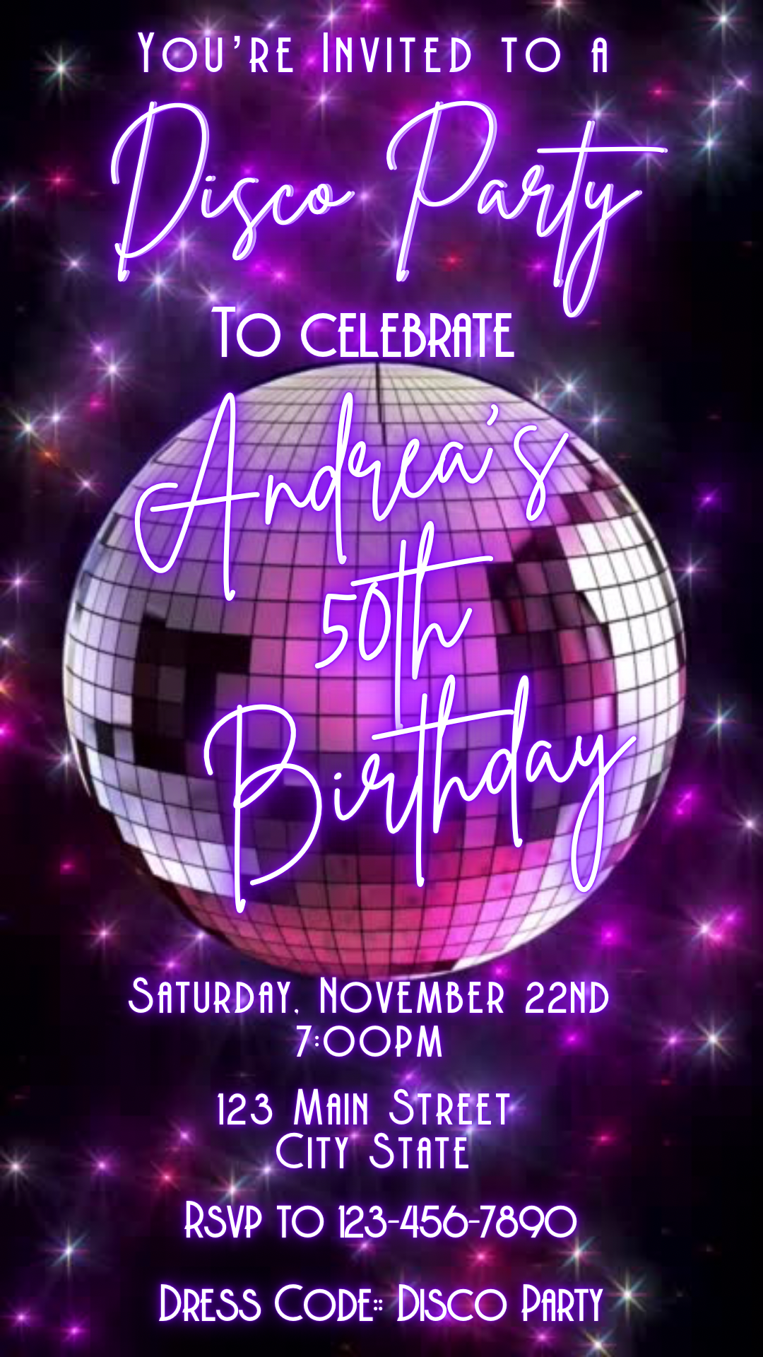 Let’s boogie! Get ready to dance the night away with this Disco Editable Video Invitation! Featuring retro 70s vibes, neon lights, glittery disco balls, and groovy party aesthetic, this invite is perfect for bachelorette parties, birthdays, girls’ nights, graduations, raves, and glow parties. Customize it with your event details and instantly share via text, email, or social media to set the tone for a high-energy, unforgettable night!