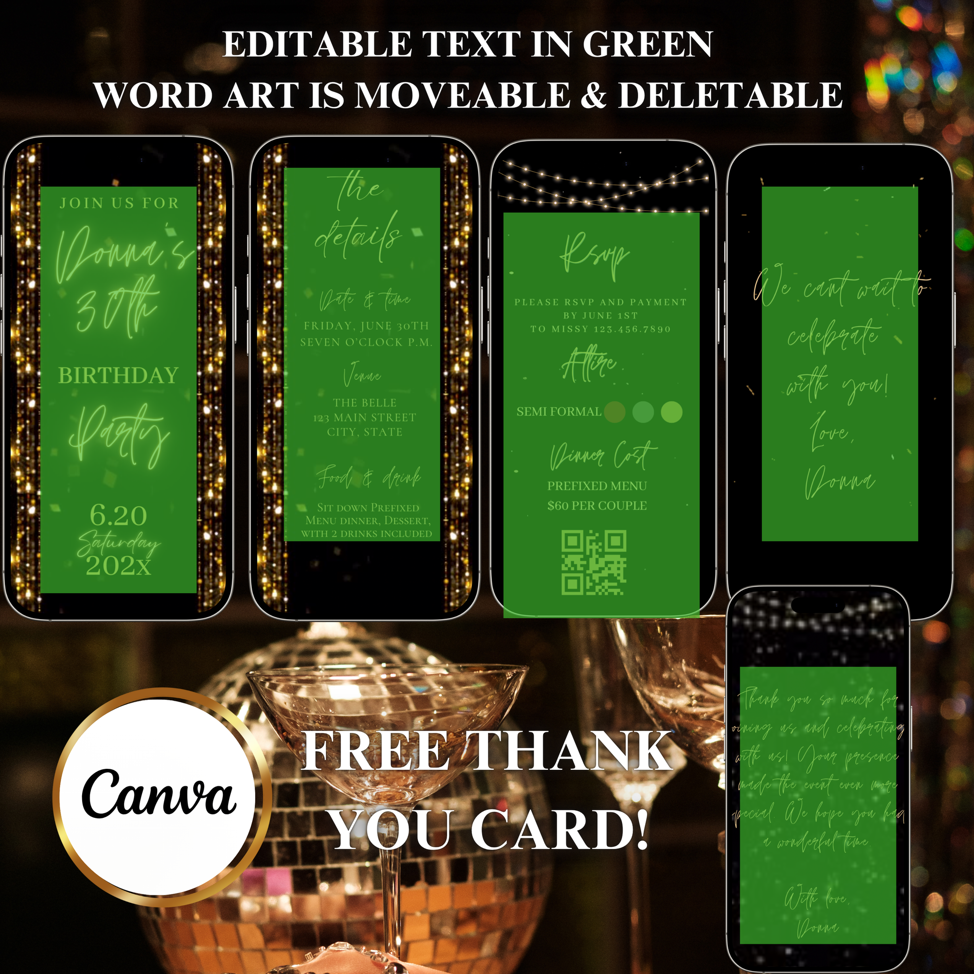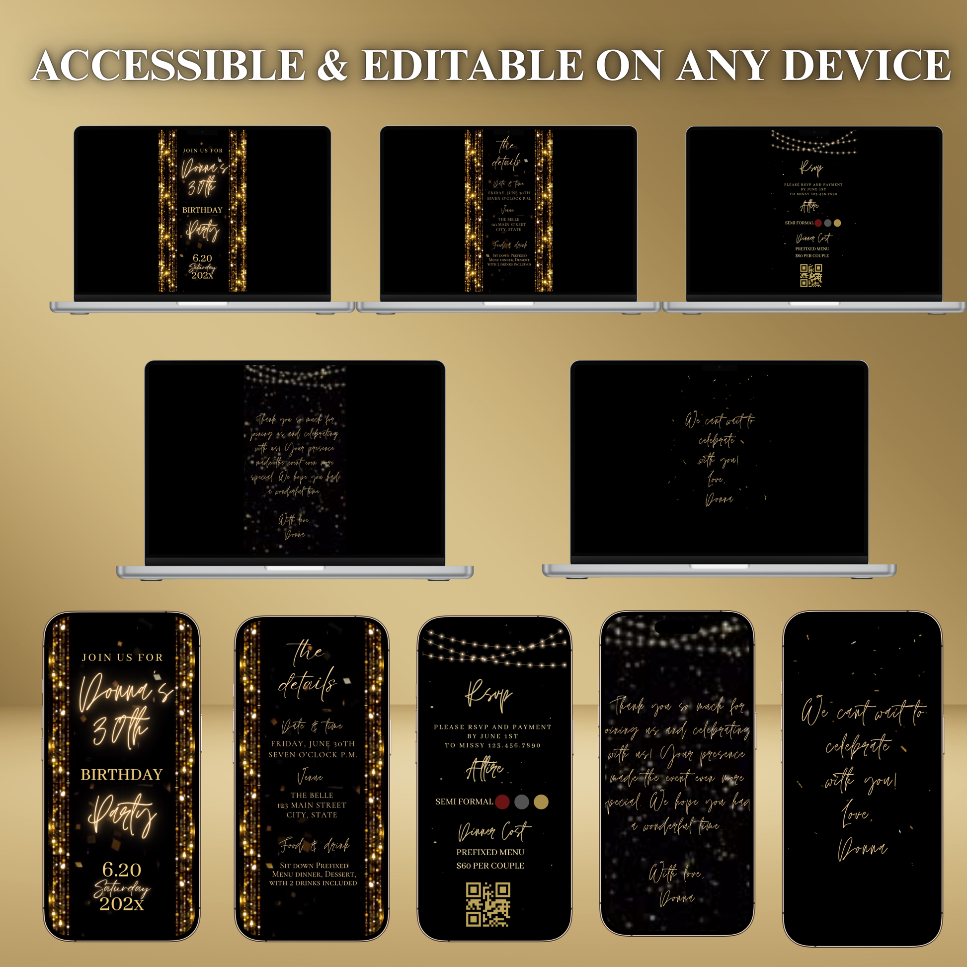 Gold Birthday Dinner Video Invitation | Digital Luxe Birthday Mobile Invite | Editable Animated Gold Glitter