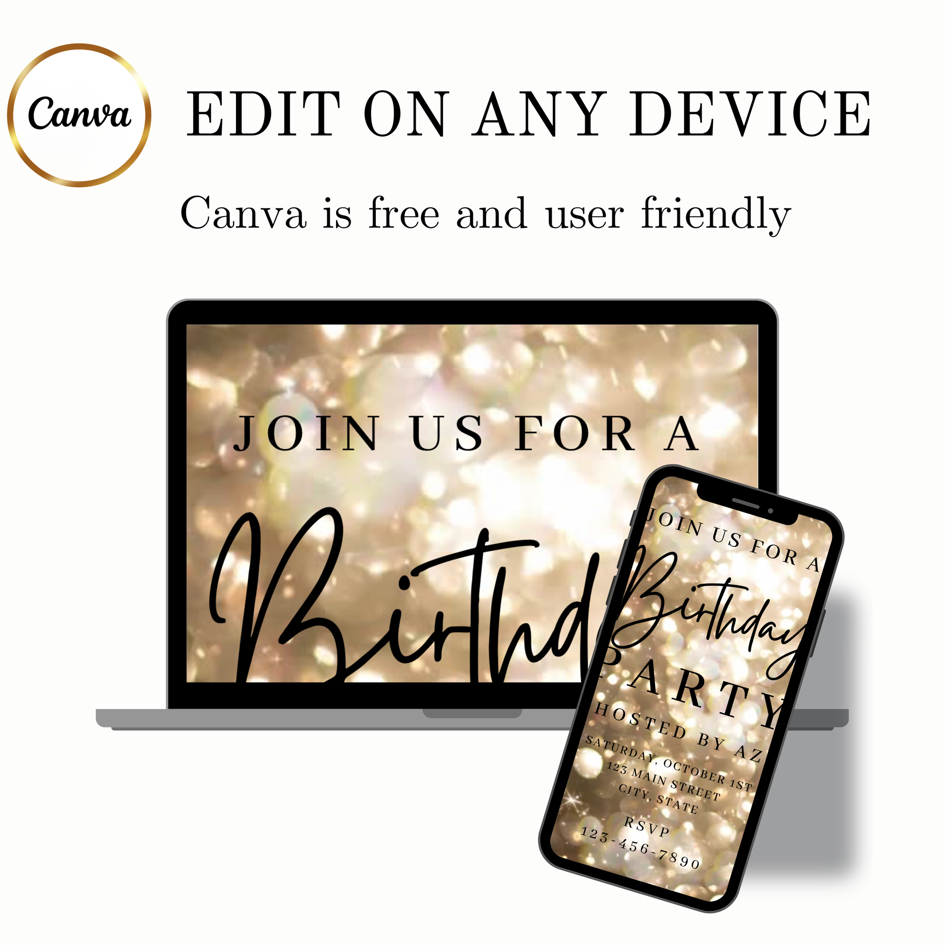 Gold Video Invitation | Animated Birthday Digital Evite | Editable Canva Invite Template