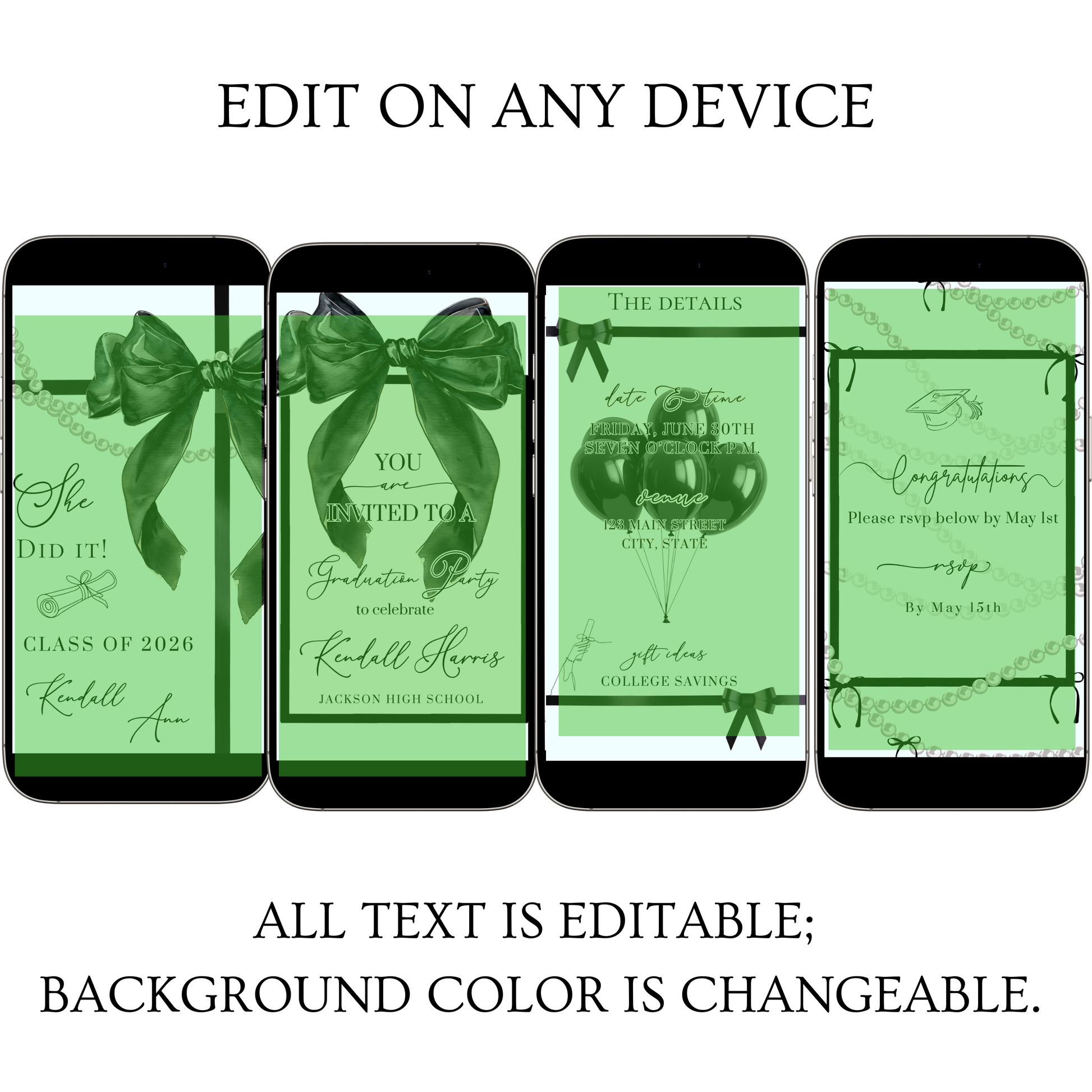 - Fully editable text fields for name, class year, date, time, and RSVP with Canva (it’s free)