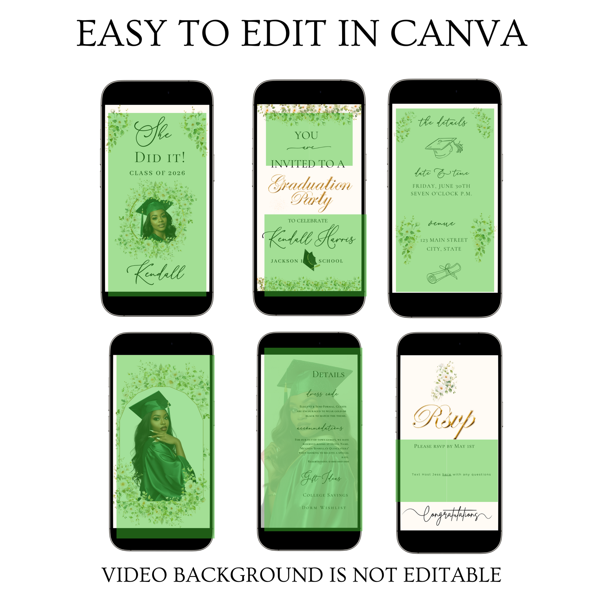 • Fully editable text fields for name, class year, date, time, and RSVP with Canva (it’s free)