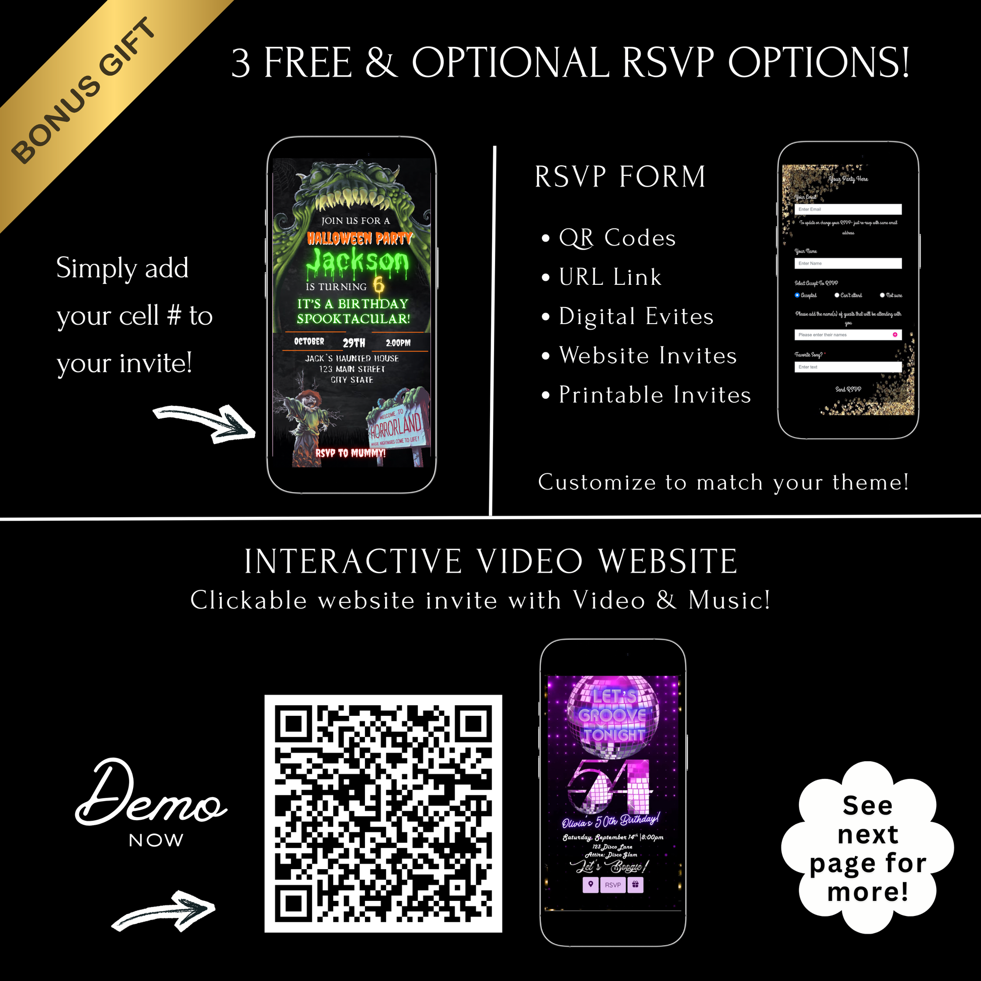 A) Create LYFETYMES Interactive Website B) LYFETYMES RSVP form- website templates, add a QR code, C) or simply add your phone number to invite.
